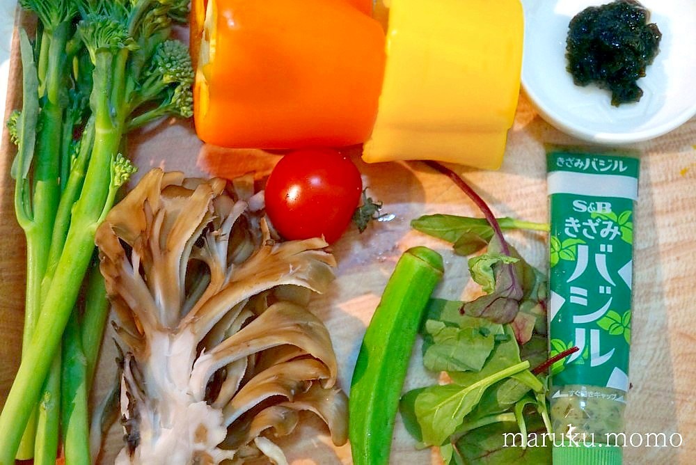●スティックセニョール(スティックブロッコリー)●オレンジ・黄パプリカ●ミニトマト●チューブのバジルソース●舞茸●オクラ●岩のり●ローズマリー