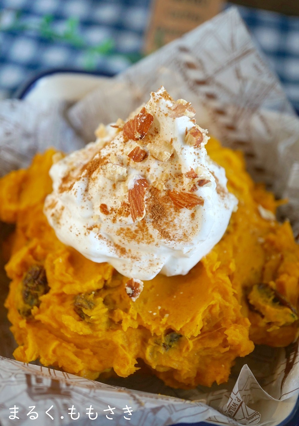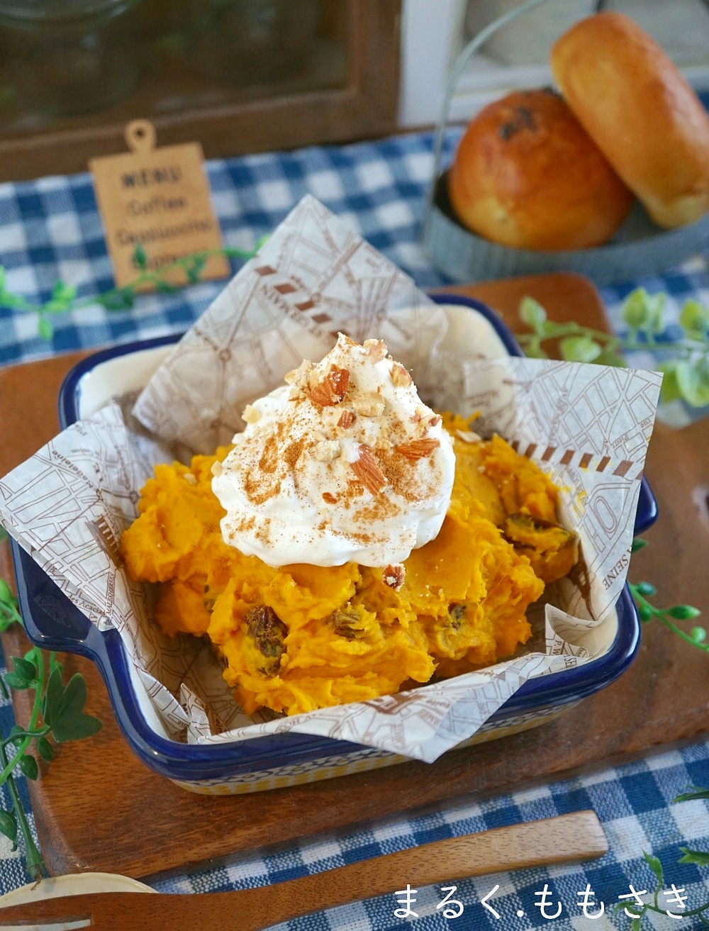 こちらはデパ地下風~かぼちゃにレーズンを入れ仕上げに生クリームを乗せシナモンとナッツをかけたスイーツサラダです。