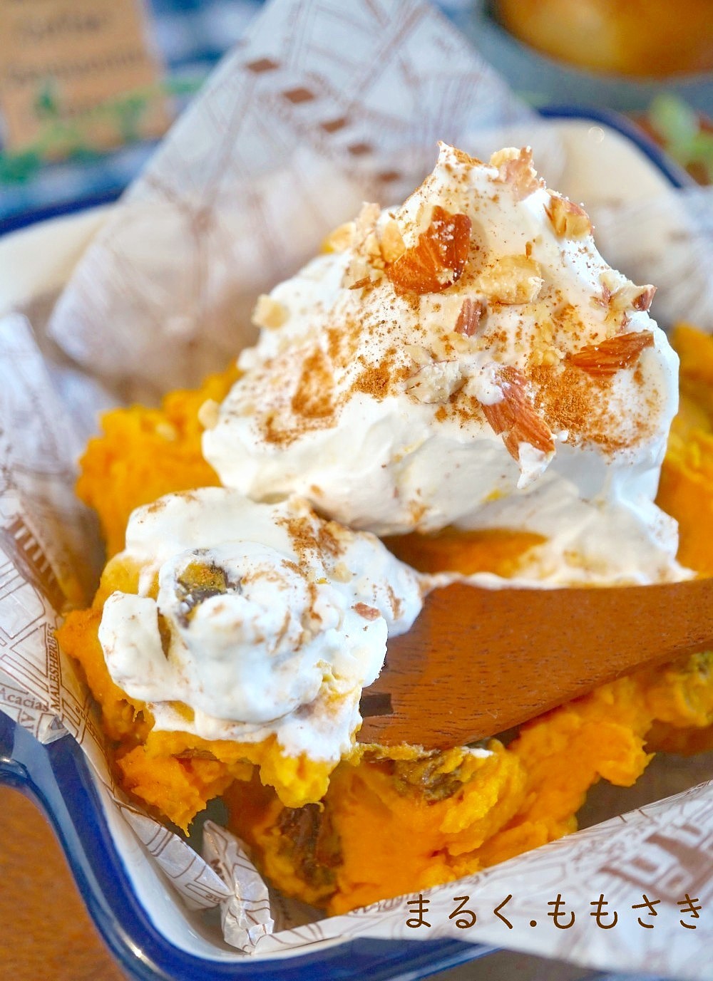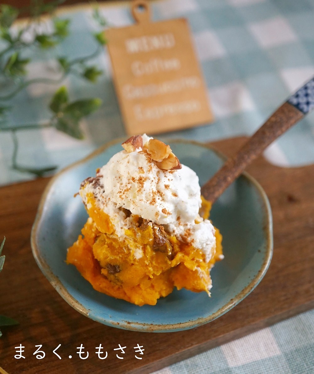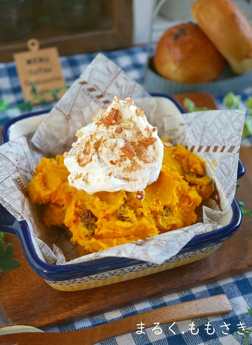 かぼちゃはレンジで作るれるので便利です♪ほんのり甘みがあり、生クリームと合わせるとまるでデザート♪かぼちゃ好きな父に持って行こうと作りましたが家でも好評でバクバク食べていました^^