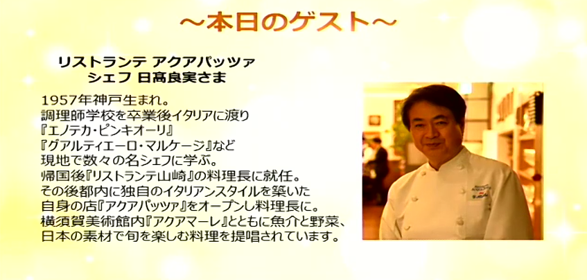 本日のゲストはお馴染みのリストランテアクアパッツァの日高シェフです。