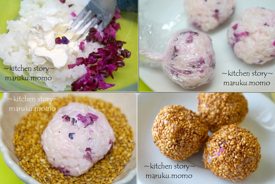 中を割ると~しば漬け効果でピンク色に染まるご飯とクリームチーズが混ざって、クリーミーなんです。周りの金ゴマは油で揚げているのでサクサクとっても香ばしいです。上に乗せた梅マヨソースがアクセントです。今回家にあったチューブ式のねり梅はしそ入り梅でしたが、普通の梅チューブで大丈夫です