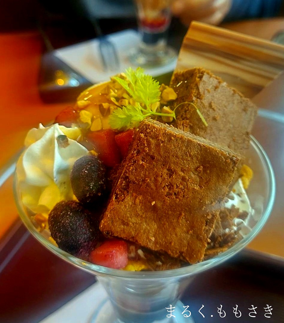 ベルギー産チョコレートを使ったチョコムースや焦がしキャラメルアイス、そしてチョコブラウニーがのった豪華なパフェです。めちゃブラウニーも濃厚で美味しかった^^底にラズベリーのソースも入り豪華でした