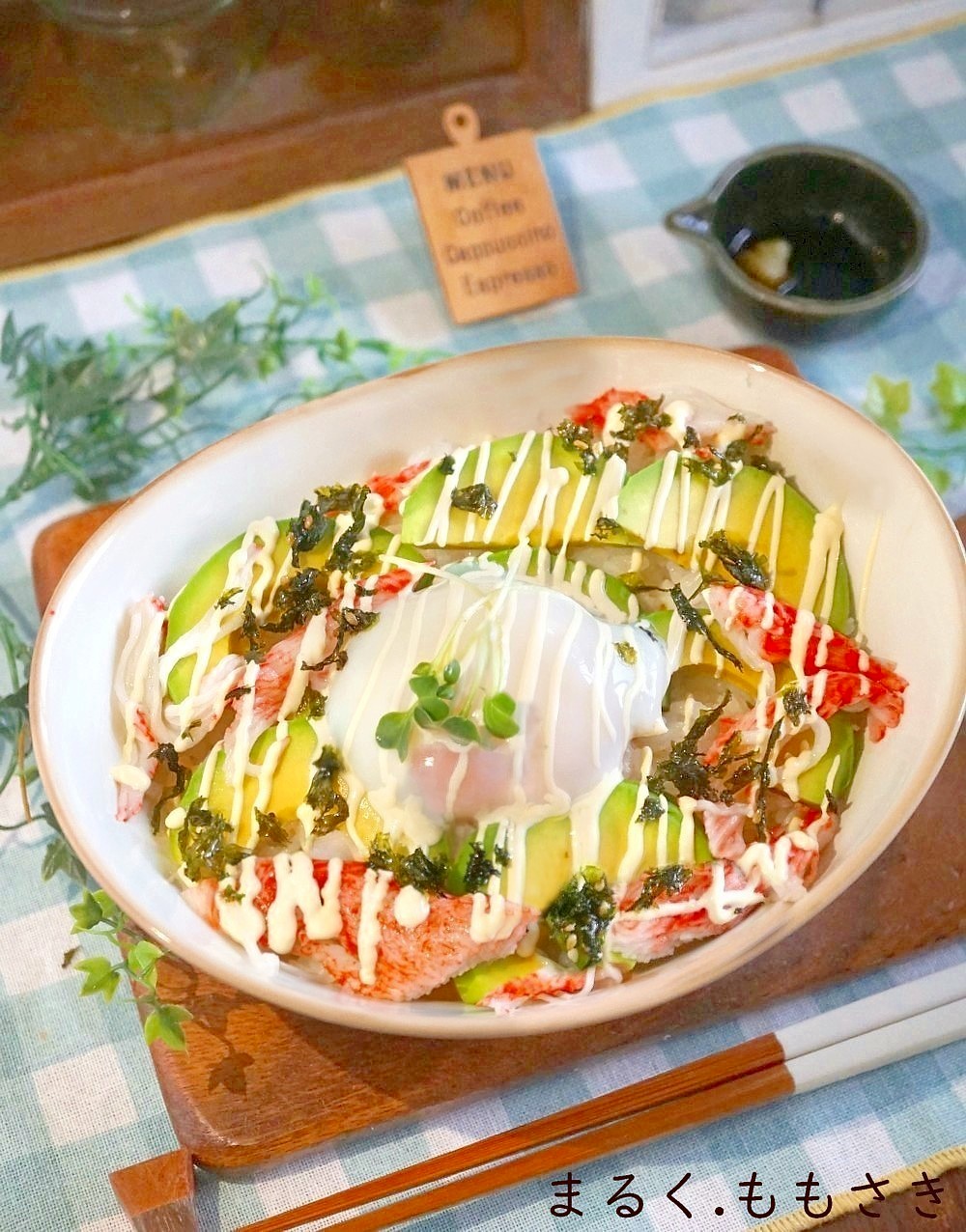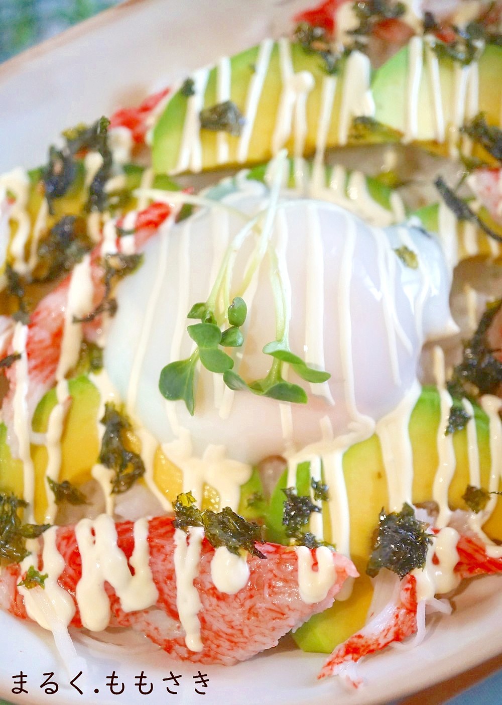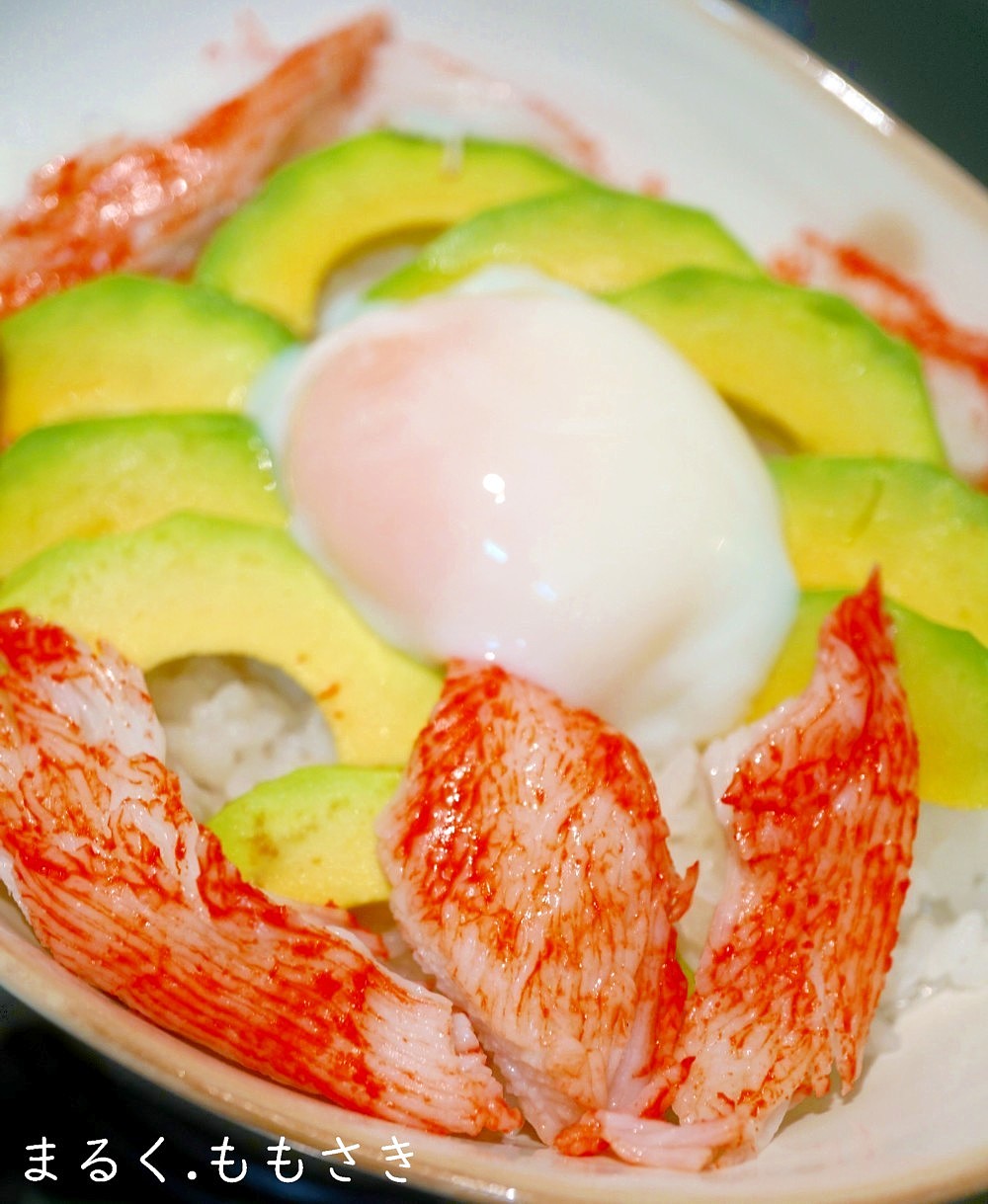 回転すしに行っても(滅多に行けないけれどw)えびとアボカドにマヨネーズが搾ったのが美味しそうで、そのエビをカニカマに変えた感じです。丼ぶり一杯食べたい夢を叶えた(笑)