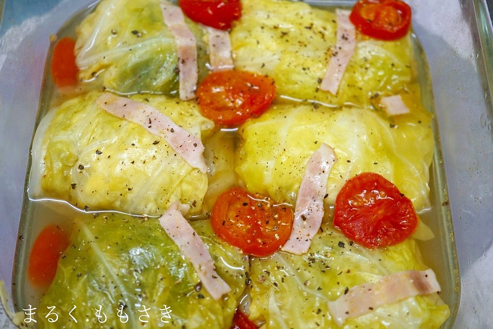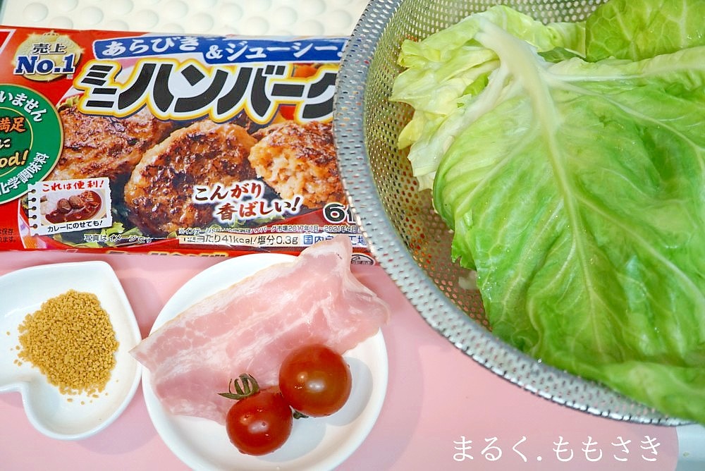冷凍ハンバーグミニサイズ6個とキャベツのおかずって言われれば何だか寂しい感じですが、ロールキャベツになるだけで豪華になりますね(笑)キャベツは普通に包む方法と、半分にカットしたキャベツを十文字に置き巻いていく簡単バージョンとツーパターン載せています♪