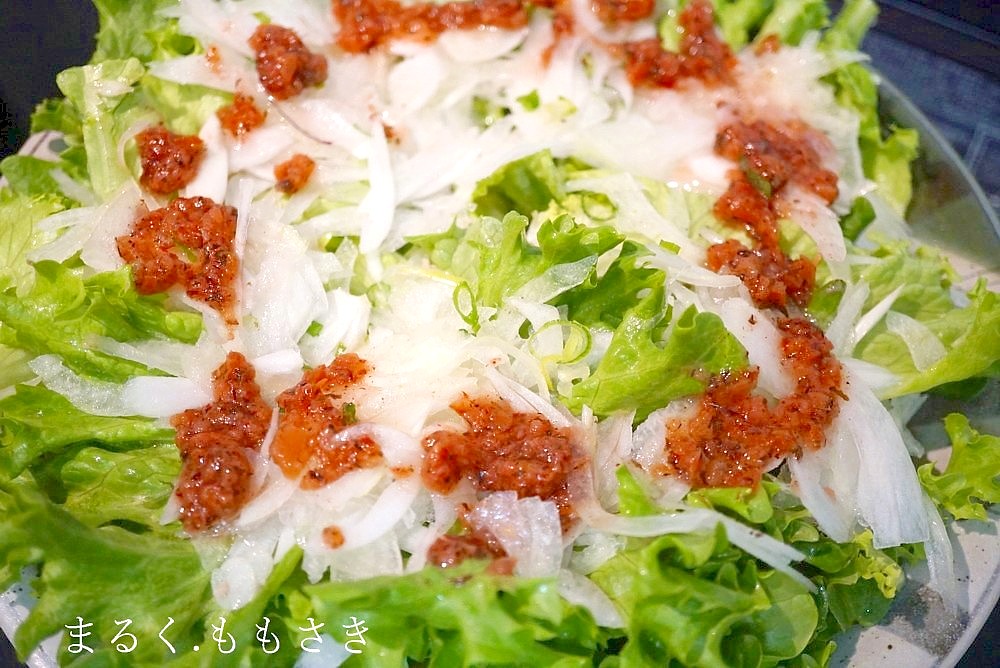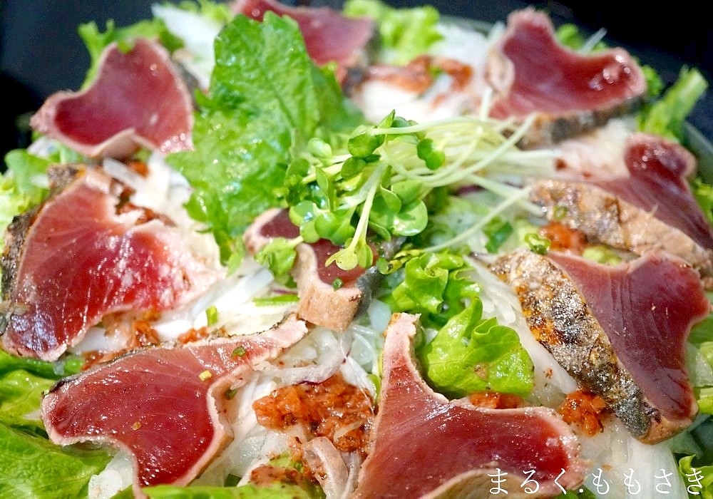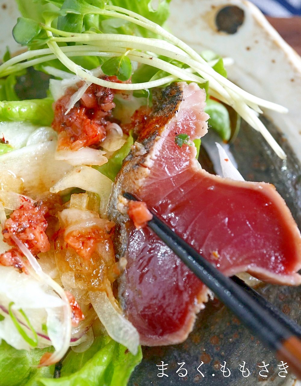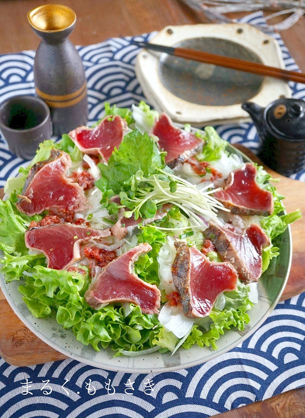 鰹のたたき、玉ねぎ(新玉ねぎ使用)、レタス、カイワレ大根を使います。隠し味に梅干しと日本酒を合わせたソースを忍ばせます♪これが凄く合います