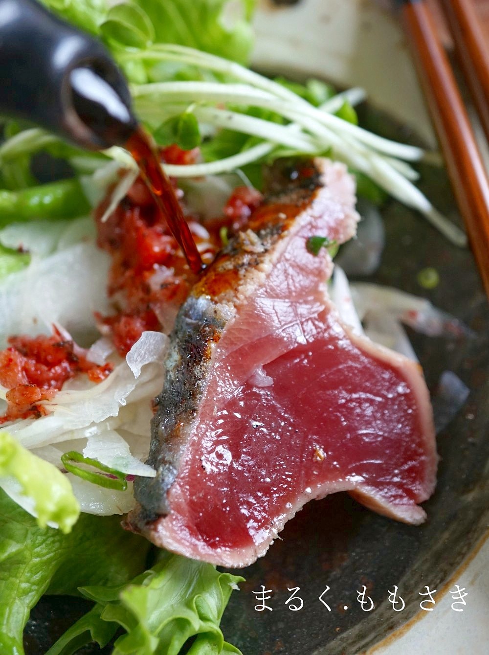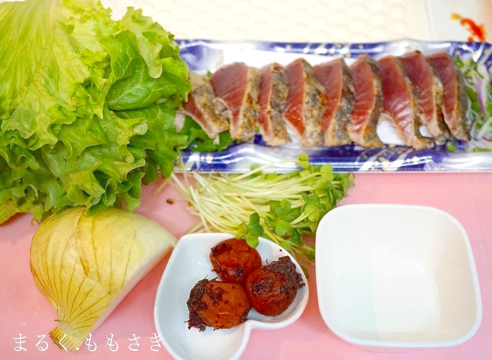 梅干しソースと鰹のたたき、新玉ねぎ、レタスに少しほろにがのカイワレ大根と一緒に食べます。飲めないけど日本酒の香りがワンランクアップにしてくれます