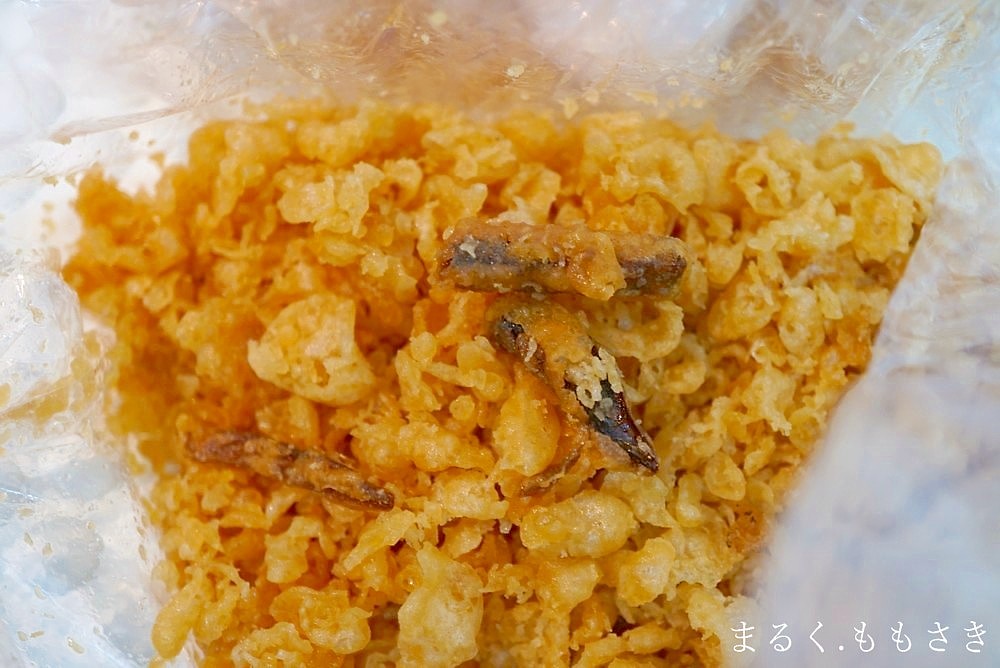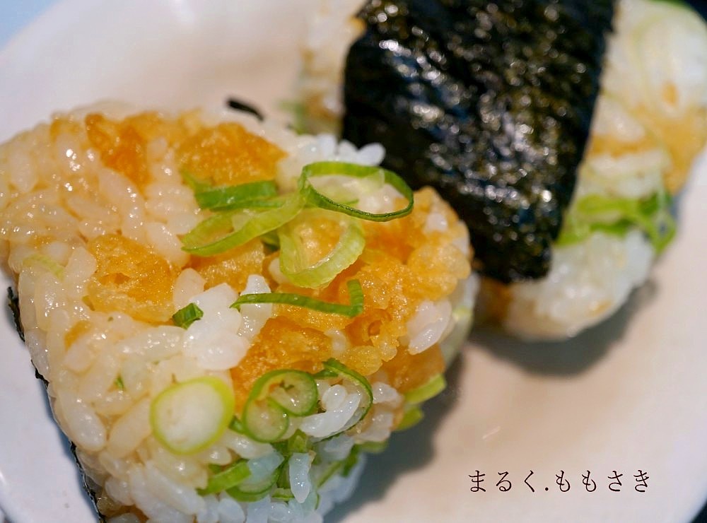 (追加)天かすとネギと麺つゆを少し垂らしたおにぎりもサクサクで天丼みたいで美味しい