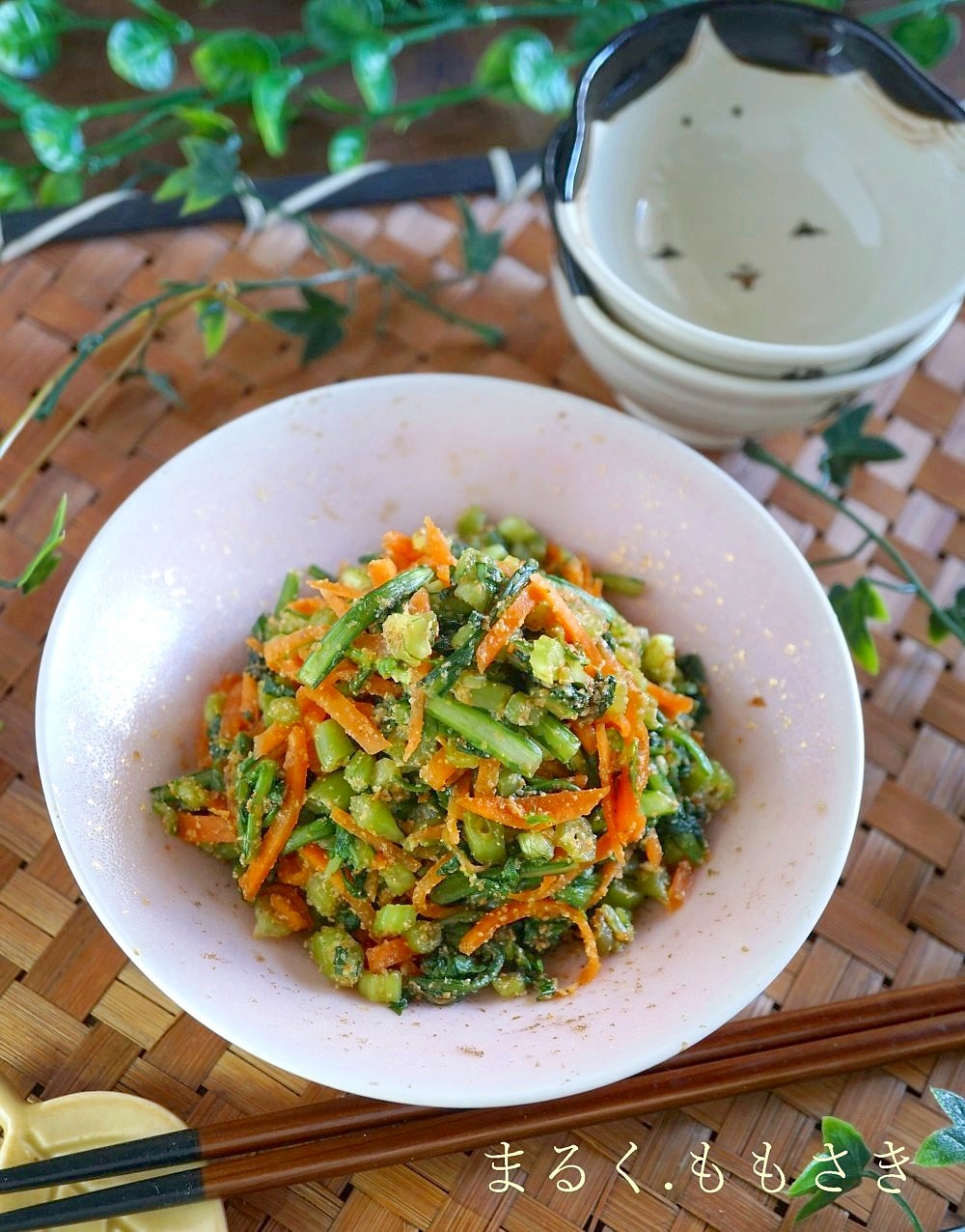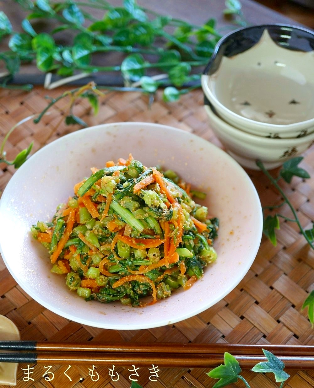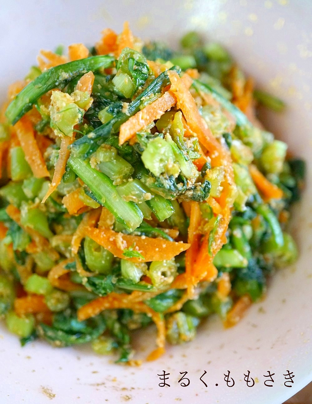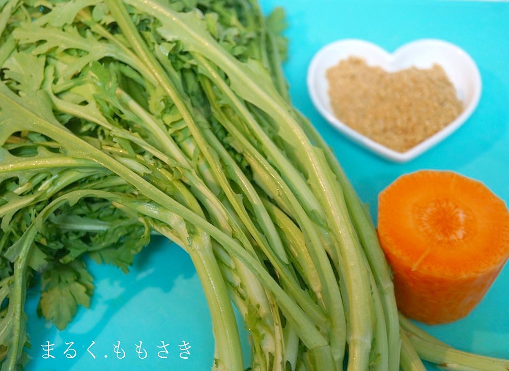 春菊の値下げ品を見つけたので、人参と合わせごま和えを作りました。