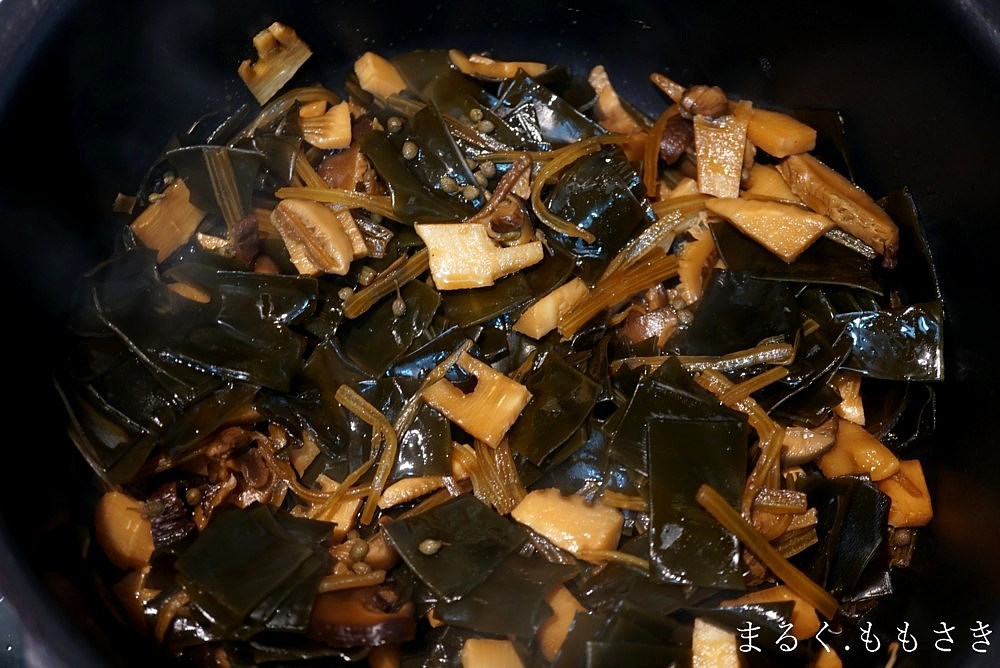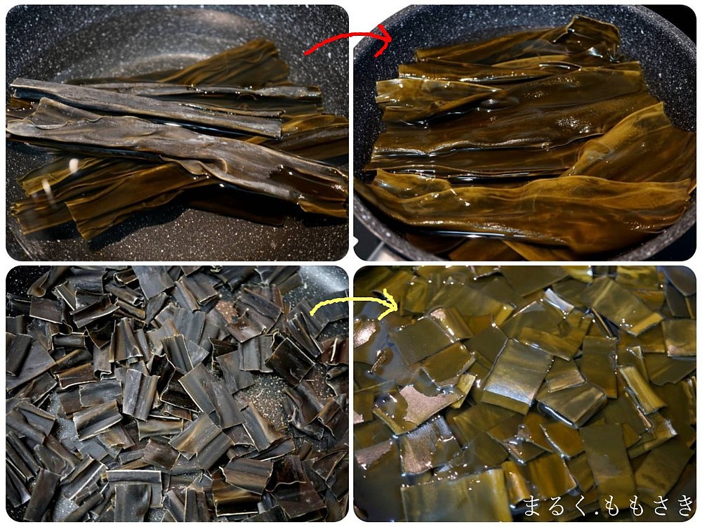●昆布は水に1時間ほど漬け柔らかく成れば1.5㎝角程に切る、もしくはカットした昆布を水に浸け柔らかく戻し、ザルに開け水気をしっかり切っておく。(※どちらも私はやりますが、初めに切ると硬いので手が痛くなる場合があります。後で切るとたくさんの量を切る気持ちになります(笑))その手間をかけてでも食べたい!!