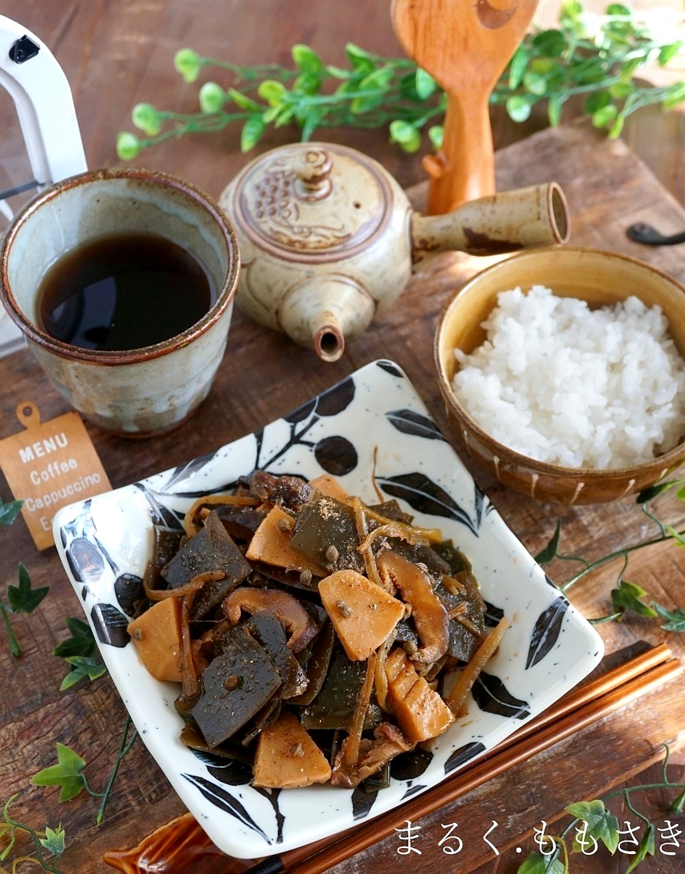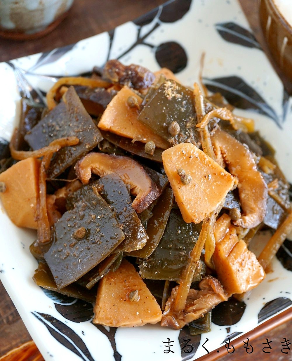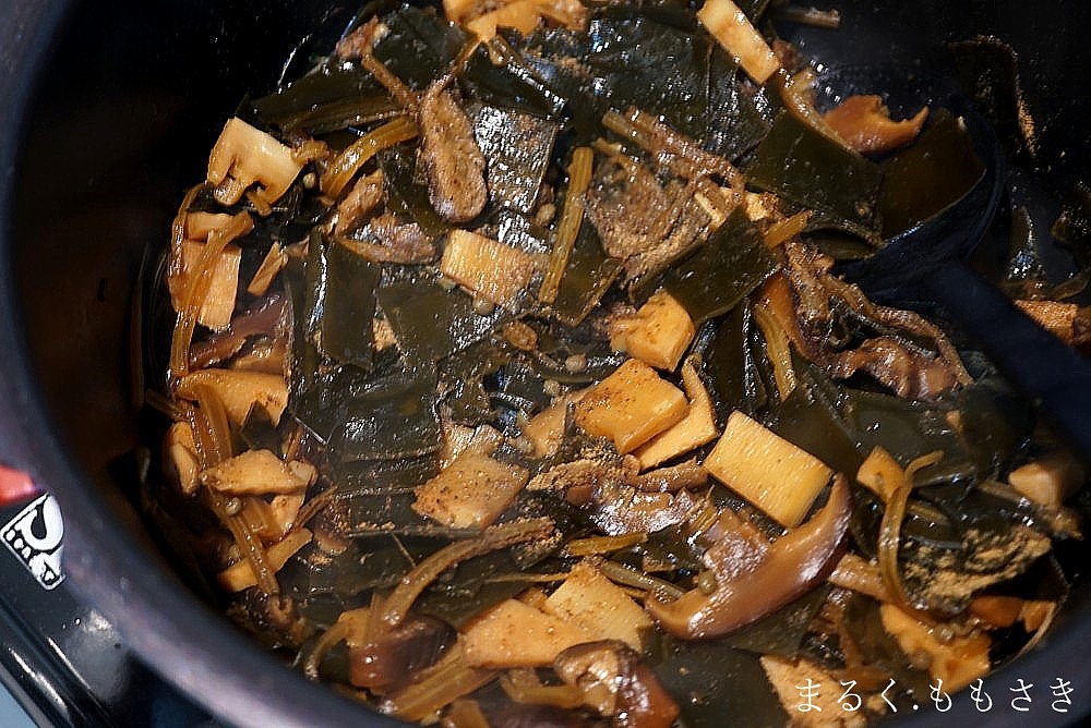 干し椎茸、竹の子の水煮を入れ、あれば山椒の実を入れるとピリッとした辛みと刺激がまたいい^^山椒の実は冷凍して使いますが、無ければ入れなくても大丈夫です。