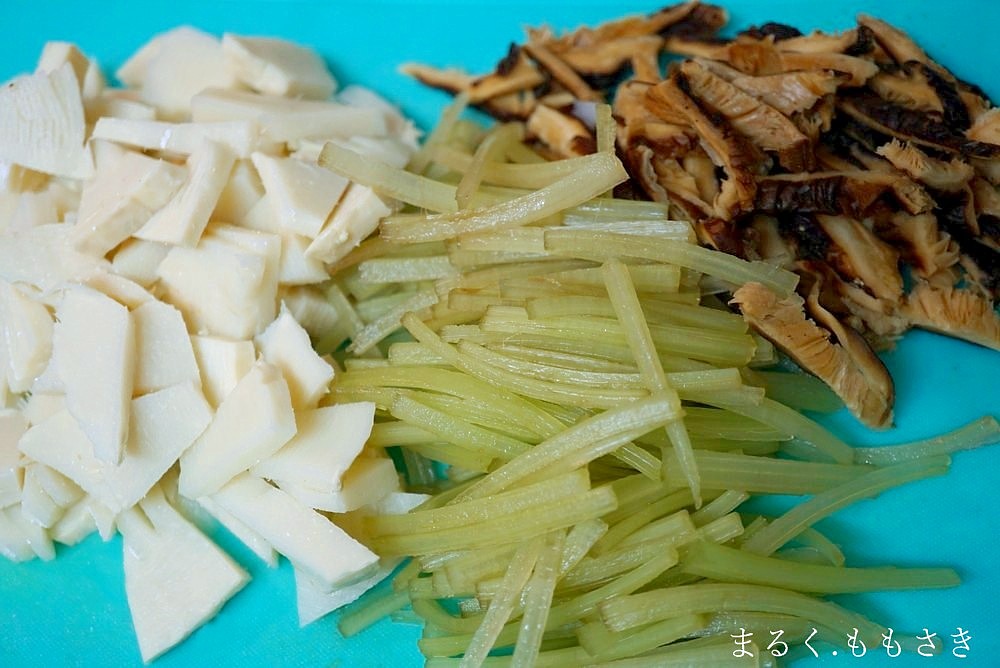 干し椎茸は水気を搾り薄切りにする。竹の子の水煮は1~1.5㎝程に切る。