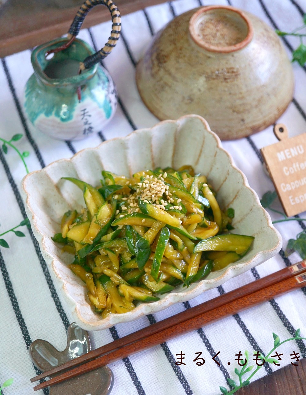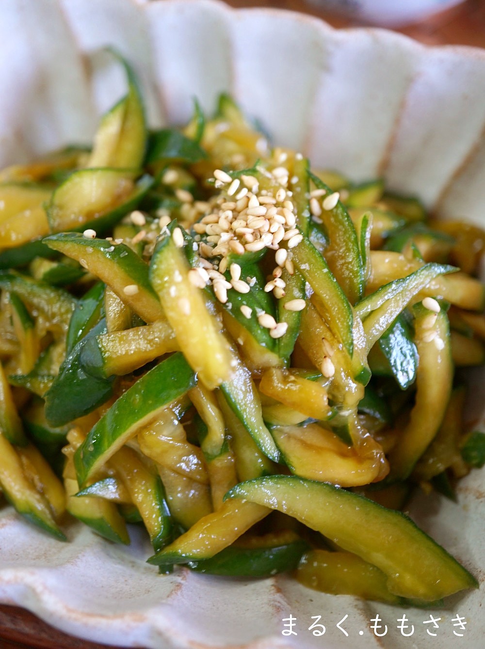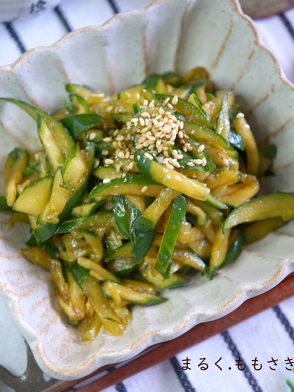きゅうりは最初に塩でもみ込む作業を省いているので、切った後にペーパーで水分は必ず拭き取ってください^^