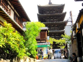 お寺の正式名は法観寺です。八坂神社と清水寺の中間にあり、聖徳太子が如意輪観音の夢のお告げにより建立されたとも言われています。五重塔(八坂塔)は重要文化財に指定されており、本瓦葺5層、方6メートル、高さ46メートルの純然たる和様建築で、白鳳時代の建築様式を今に伝えるものです。創建以来何度も災火により焼失しましたがその都度再建され現在の塔は永享12年(1440)に足利義教(よしのり)によって再興されました。 他の伽藍(がらん)は応仁の乱ですべて焼失しこのシルエットの五重塔だけが残りました。