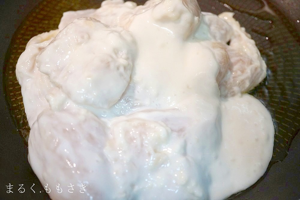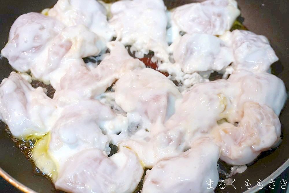 ヨーグルトに漬けることでお肉を柔らかくする効果もありますね^^焼く時に片栗粉をたっぷり入れると、皮が出来、まるで見た目は餃子みたいです(笑)皮がカリッとしてもっちリ部分もありお肉は柔らかくいただけます