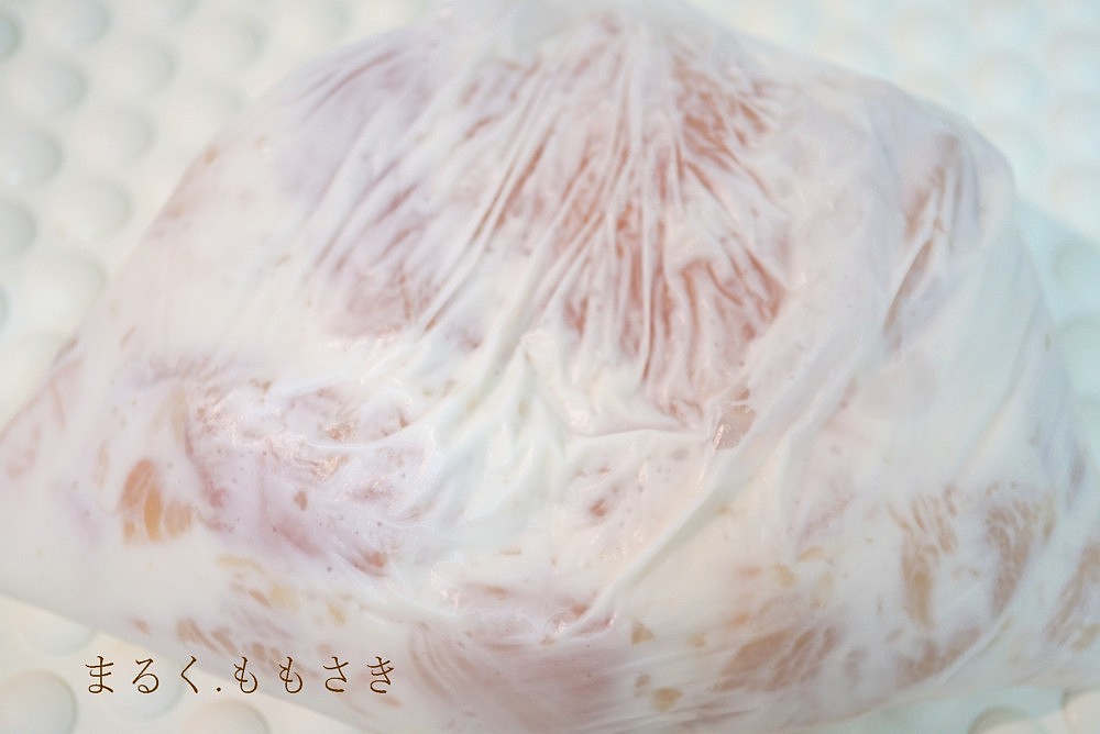●ビニール袋に★を入れ袋の上から全体をしっかり混ぜ、鶏肉を入れ全体を揉み込み空気を出来るだけ抜き冷蔵庫で3時間寝かす。