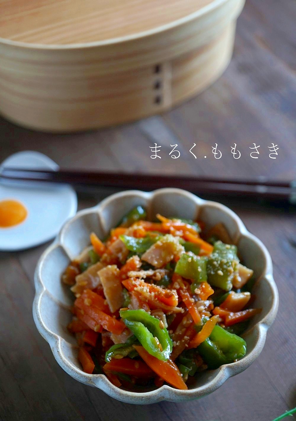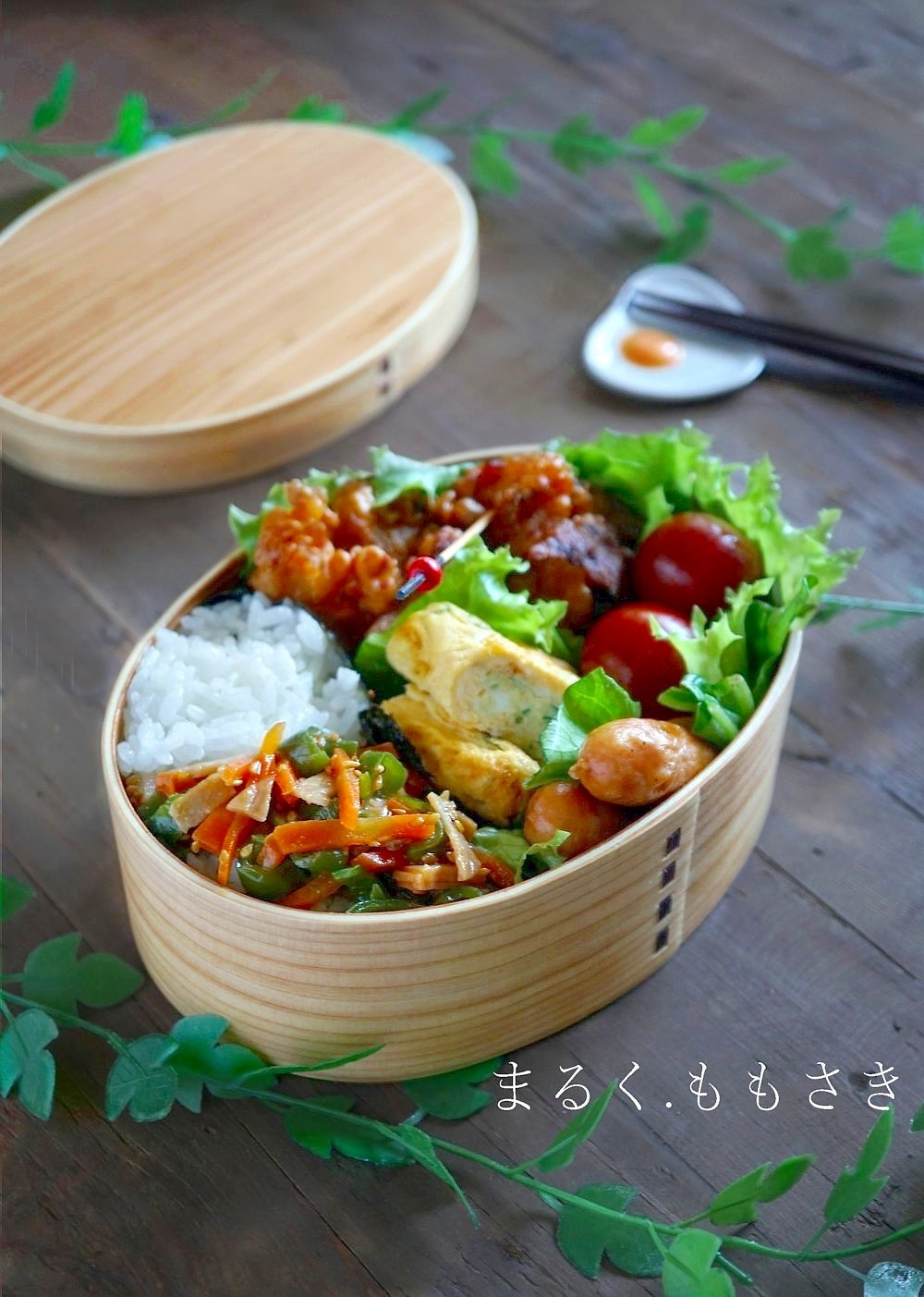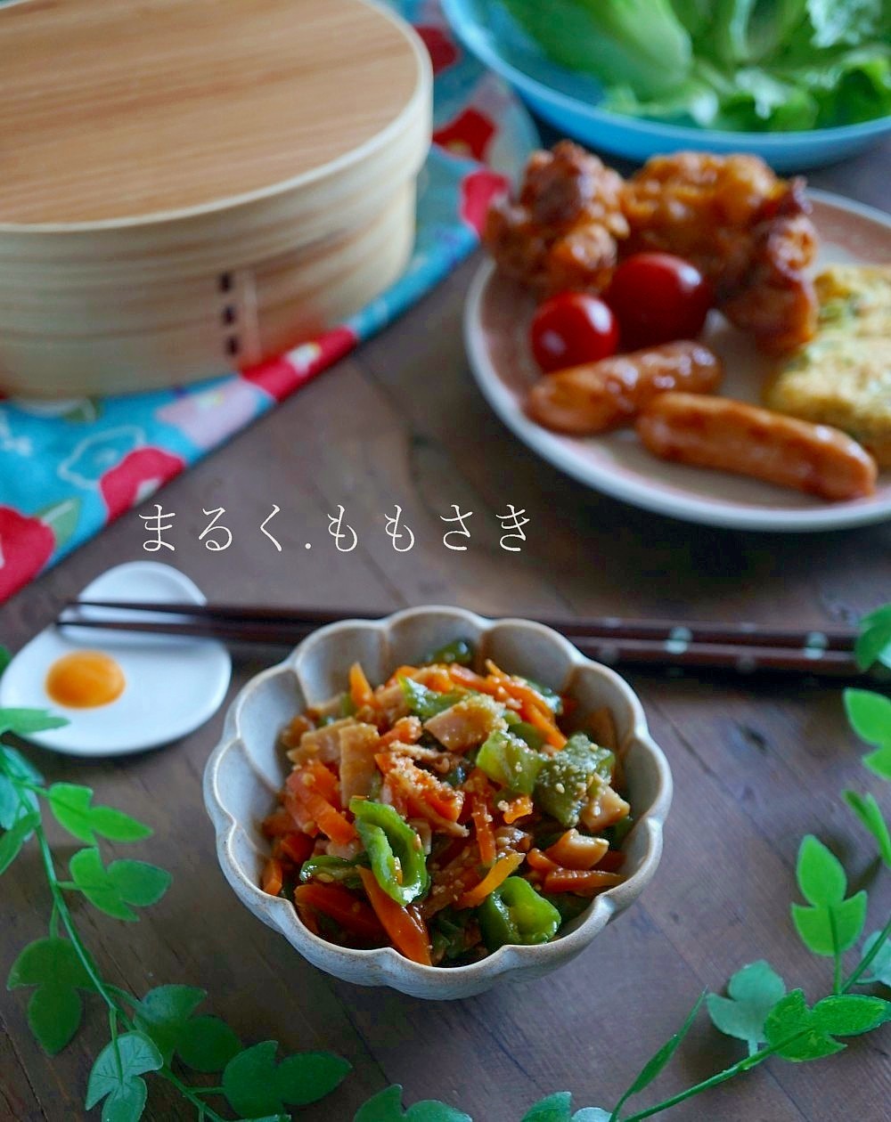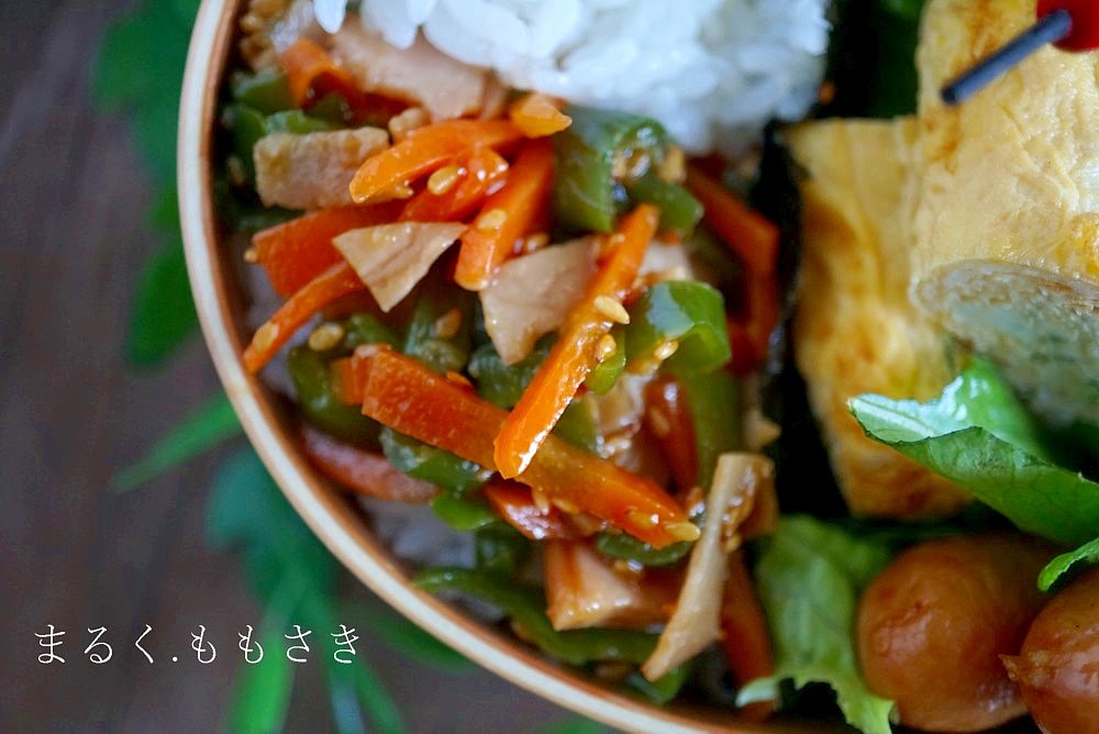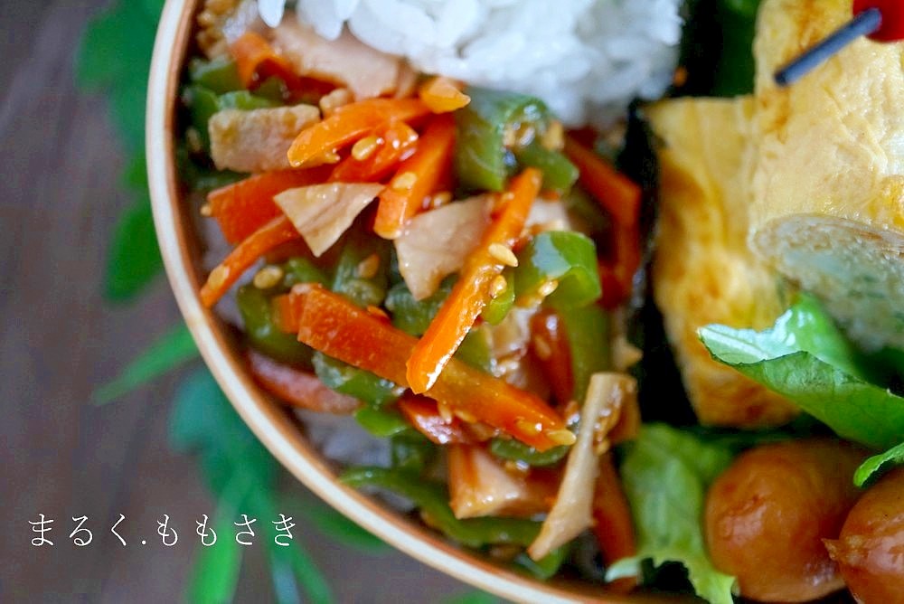 ピーマンと人参とハムのオイスターソース炒めを1個前にレシピ出したので、お弁当箱のレポです。出勤組と学校組の家族には詰め終わり、これは大学がオンライン中で家にいる次男の分に同じおかずを詰めました!