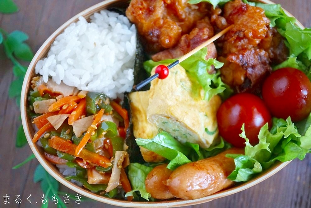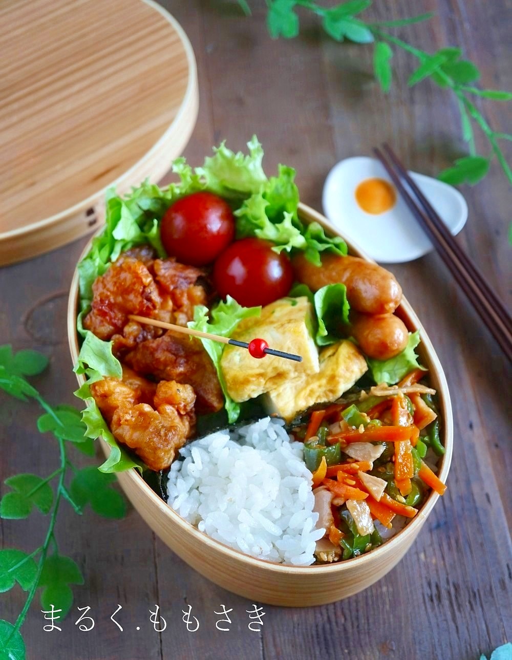 お弁当映えすると言われているレタスを先にさっと敷き、から揚げ、ネギ入り卵焼き、ソーセージ、プチトマト、そしてピーマンと人参とハムのオイスターソース炒めを詰めました。仕切りにもレタス(笑)