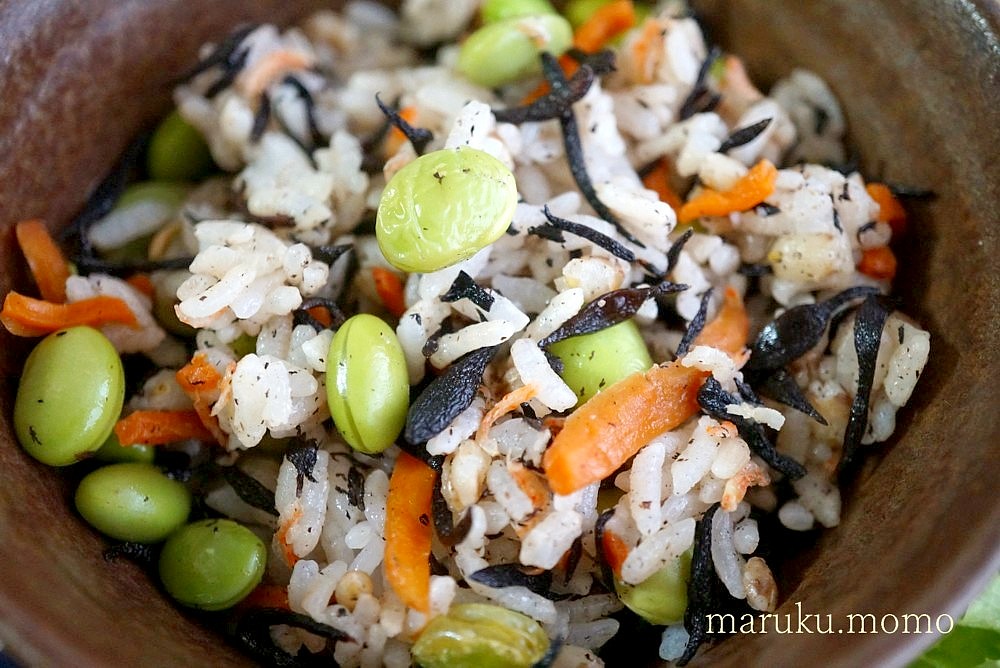 ヒジキや枝豆、人参やゴマなど~ほんと具沢山なご飯。味付けもシンプルでおかずと食べても合うお味になっています