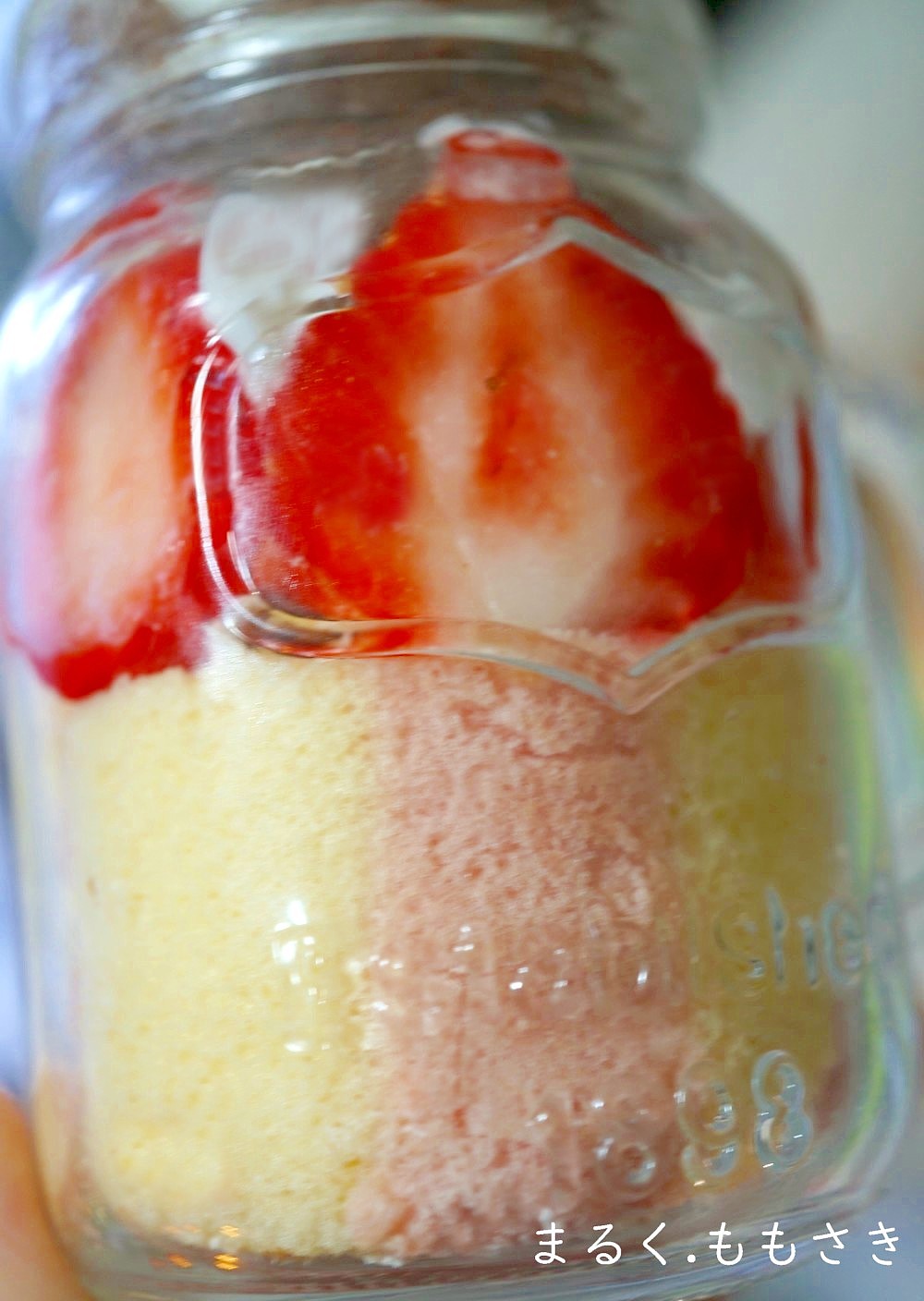ストライプケーキのクリームを外した外側を切りグラス底に詰め、外したクリーム部分を中に詰め、苺をスライスしてグラス周りに付け、泡立てて生クリームを搾り~チョコ生地を丸く切り上に蓋をしました。※生クリームは180mlに砂糖小さじ1、コアントロー小さじ1を入れ泡立ています。※生地に合わせ砂糖は控えめに入れています。市販のホイップクリームを使えばより簡単ではあります^^