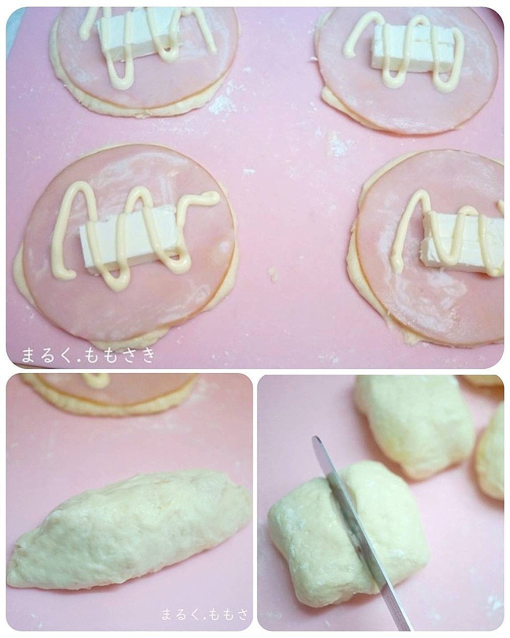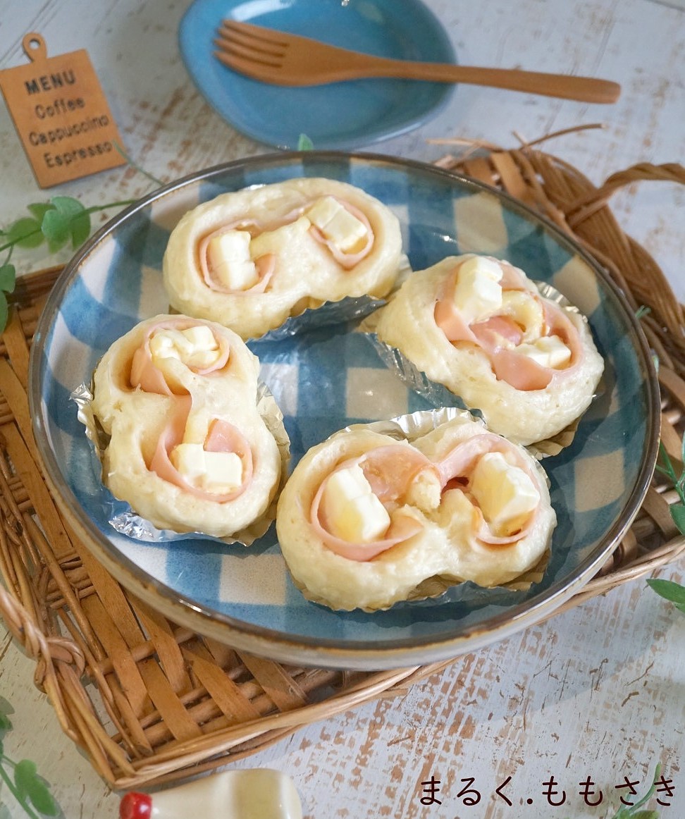 時短で作る肉まん生地を使いハムとクリームチーズを巻いた蒸しパンを作りました。