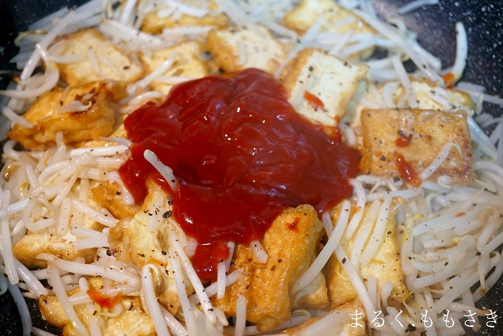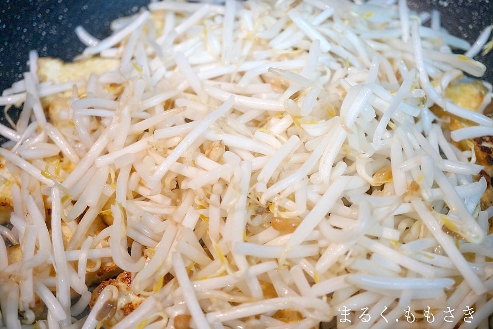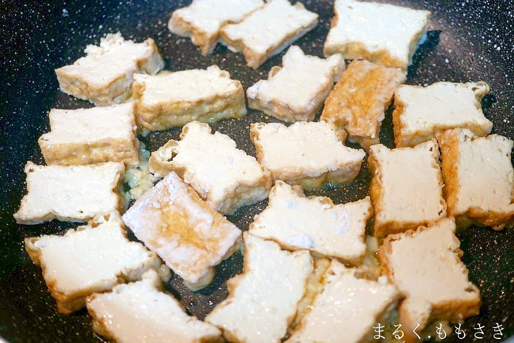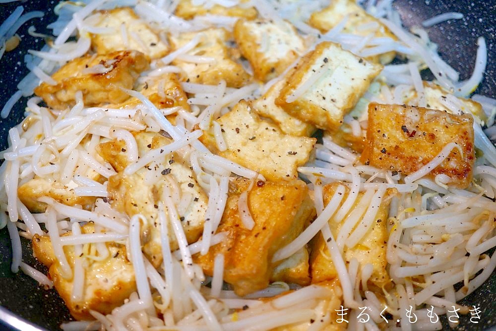 ●厚揚げは1cmにカットし片栗粉をまぶす。もやしは3㎝くらいにカットする。
