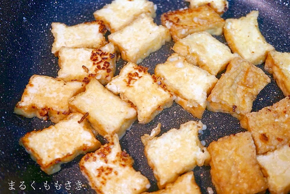 厚揚げに片栗粉をまぶしたのでソースにとろみが出て全体が均一に絡まります。