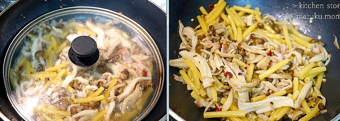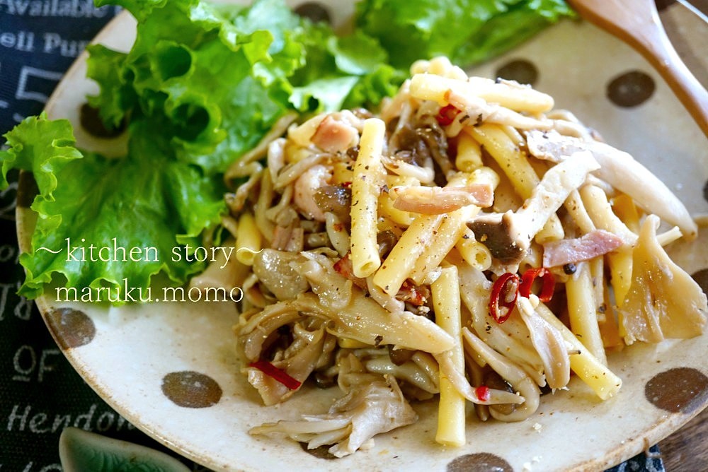 卵を絡めて~って間違いないですよね(笑)ガーリックが効いて鷹の爪のピりっと感最高です。マカロニは25gなんて信じられない~キノコたっぷりでお腹も大満足でした