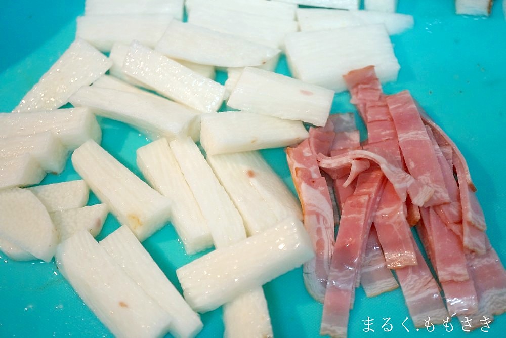 ベーコンは1cm幅にカットする。