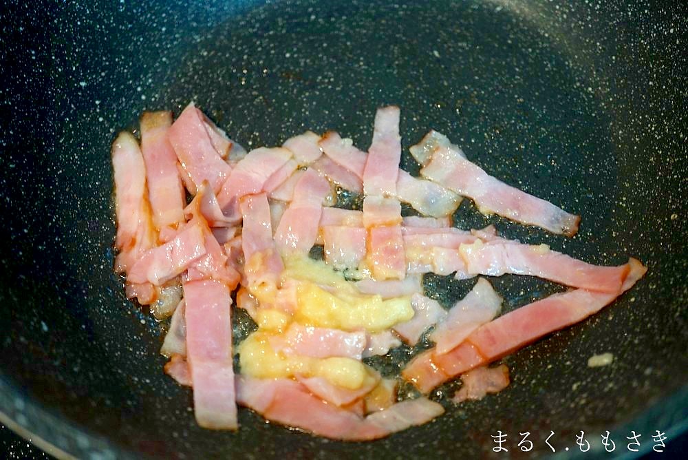 ニンニクもベーコンも旨味アップには欠かせない食材だ。