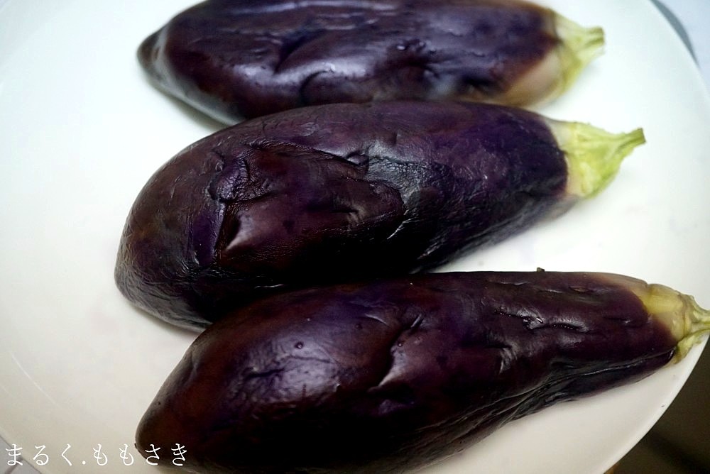 ナスを1個ずつレンジ600wで2分かける。もしくは3個をレンジに入れる場合は3分かけ、裏返し2分半かける。粗熱が取れるまで10分ほど置く。