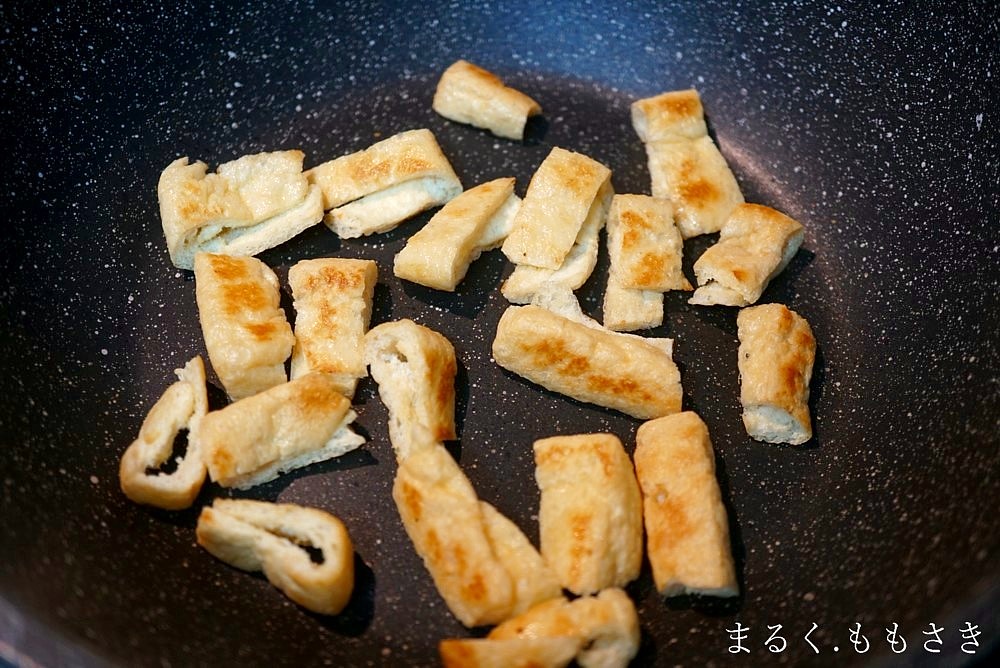 油揚げを洗いペーパーで包んで水気をしっかり取り除き3㎝程にカットする。