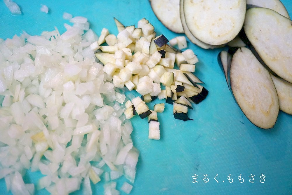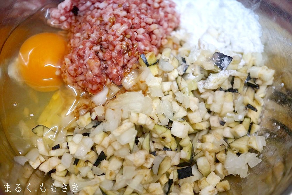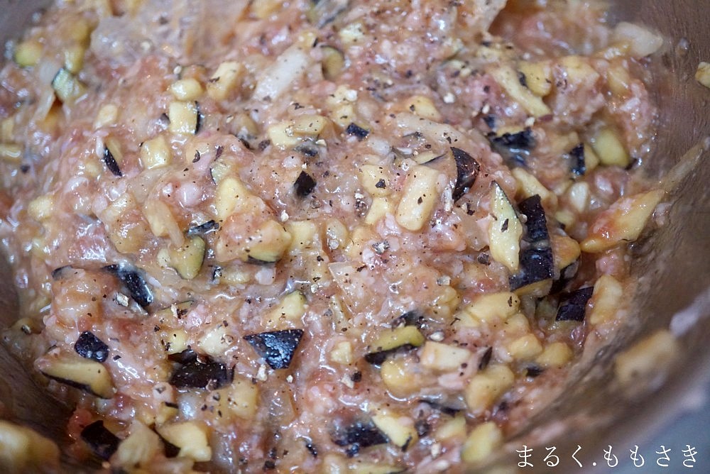 お茄子も玉ねぎも炒めたりチンしたり、火を通さずそのまま使ったので、野菜の水分もひき肉に入りとってもジューシーになるんです
