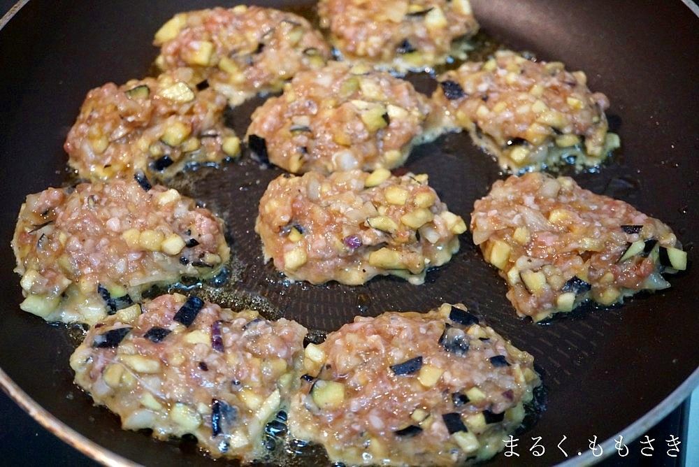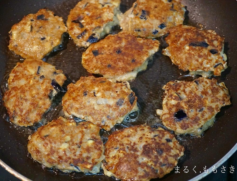 お茄子と玉ねぎをみじん切りにし、ひき肉と焼き肉のたれ、卵、塩、片栗粉を入れ混ぜ焼くだけ。