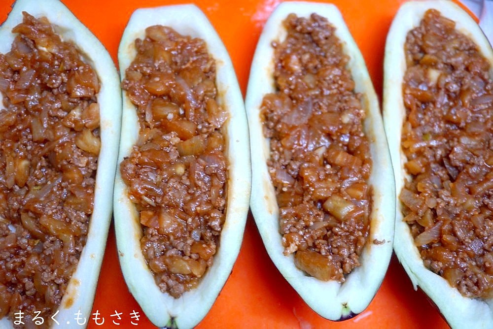 先日お気に入りの食生活ロビア店で米茄子が綺麗で大きくって1個80円だったので買ってきました。それで中身をくりぬき、ひき肉と玉ねぎと炒め中に詰めチーズを乗せトースターで焼きました。若い頃よく作っていた1品