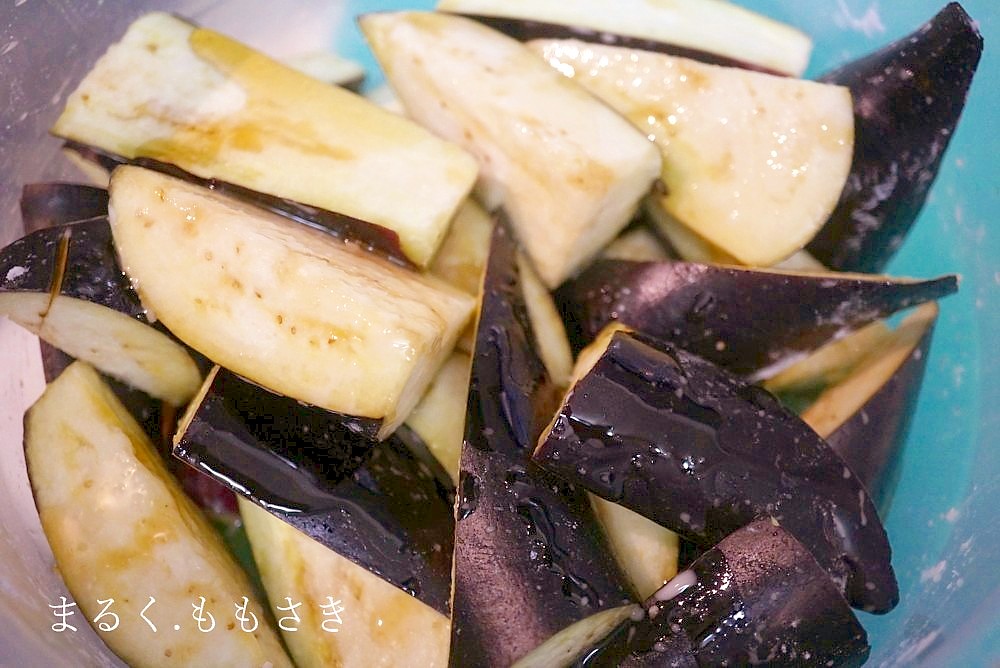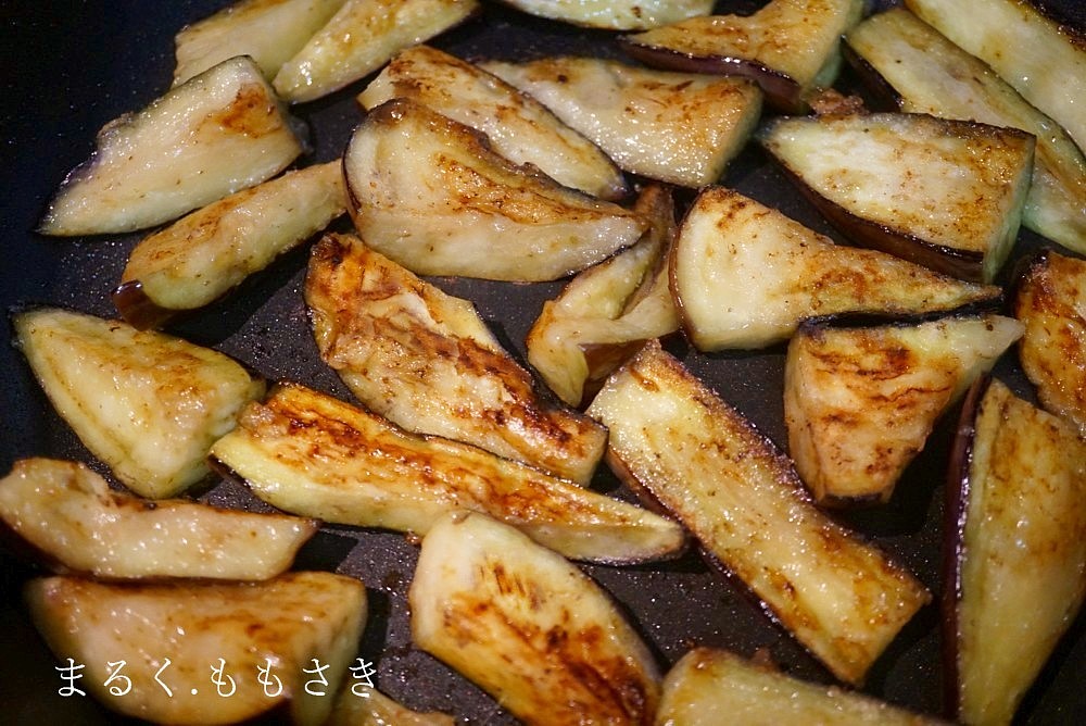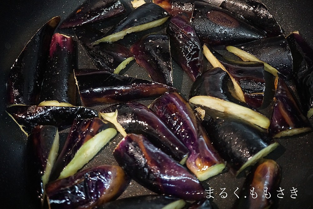 茄子は油を吸収するので多めの油が必要になりますが、いつも書くように炒める前に油を茄子にかけ全体に混ぜると均等に火が入ります^^