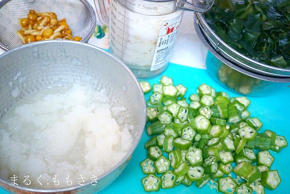 わが家のネバネバ系は、長芋、オクラ、なめこ~大好きなワカメ、そして大根おろしを入れ混ぜるだけ。