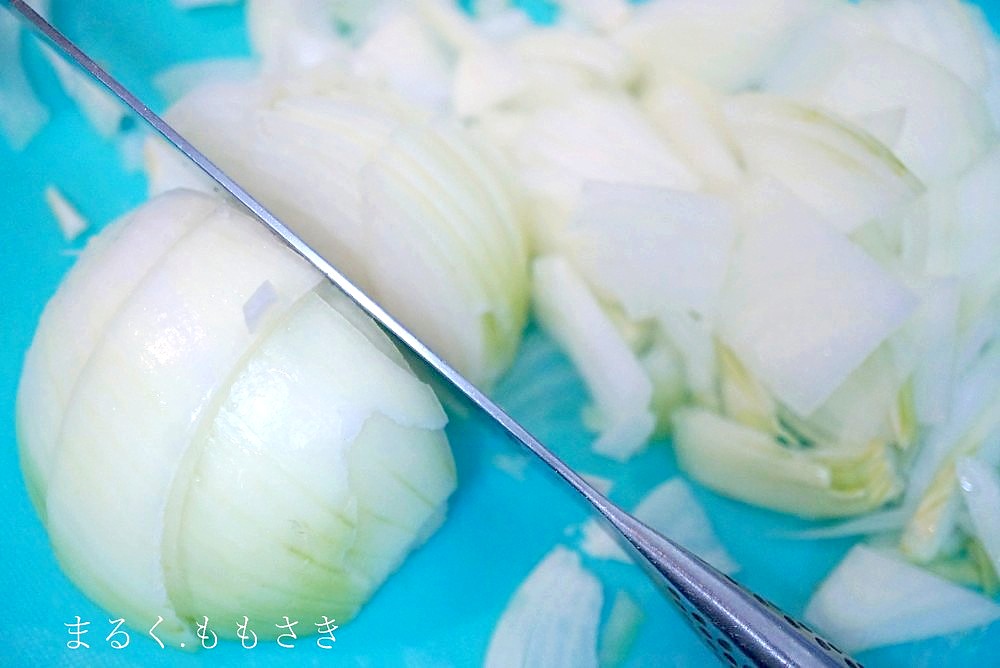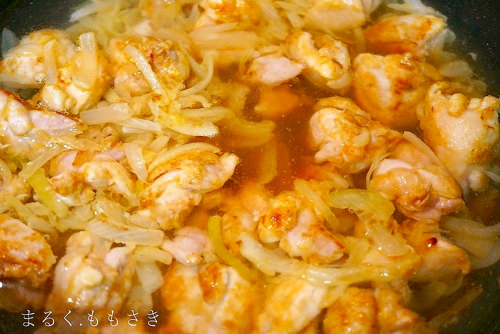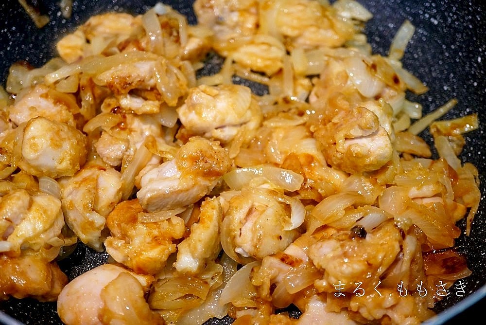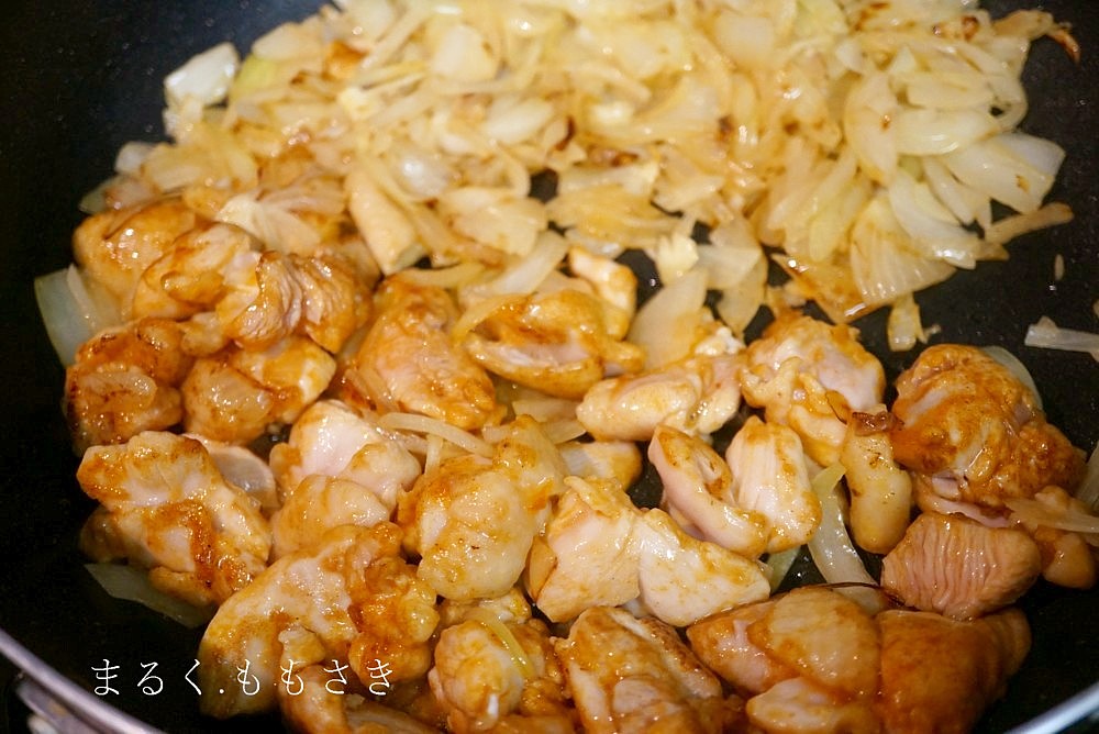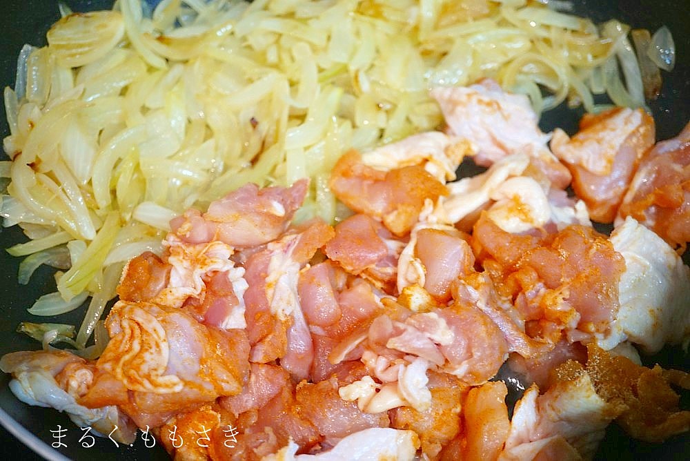 玉ねぎをフライパンの奥にし、オリーブオイルを少し足し鶏もも肉を入れ2~3分炒める。
