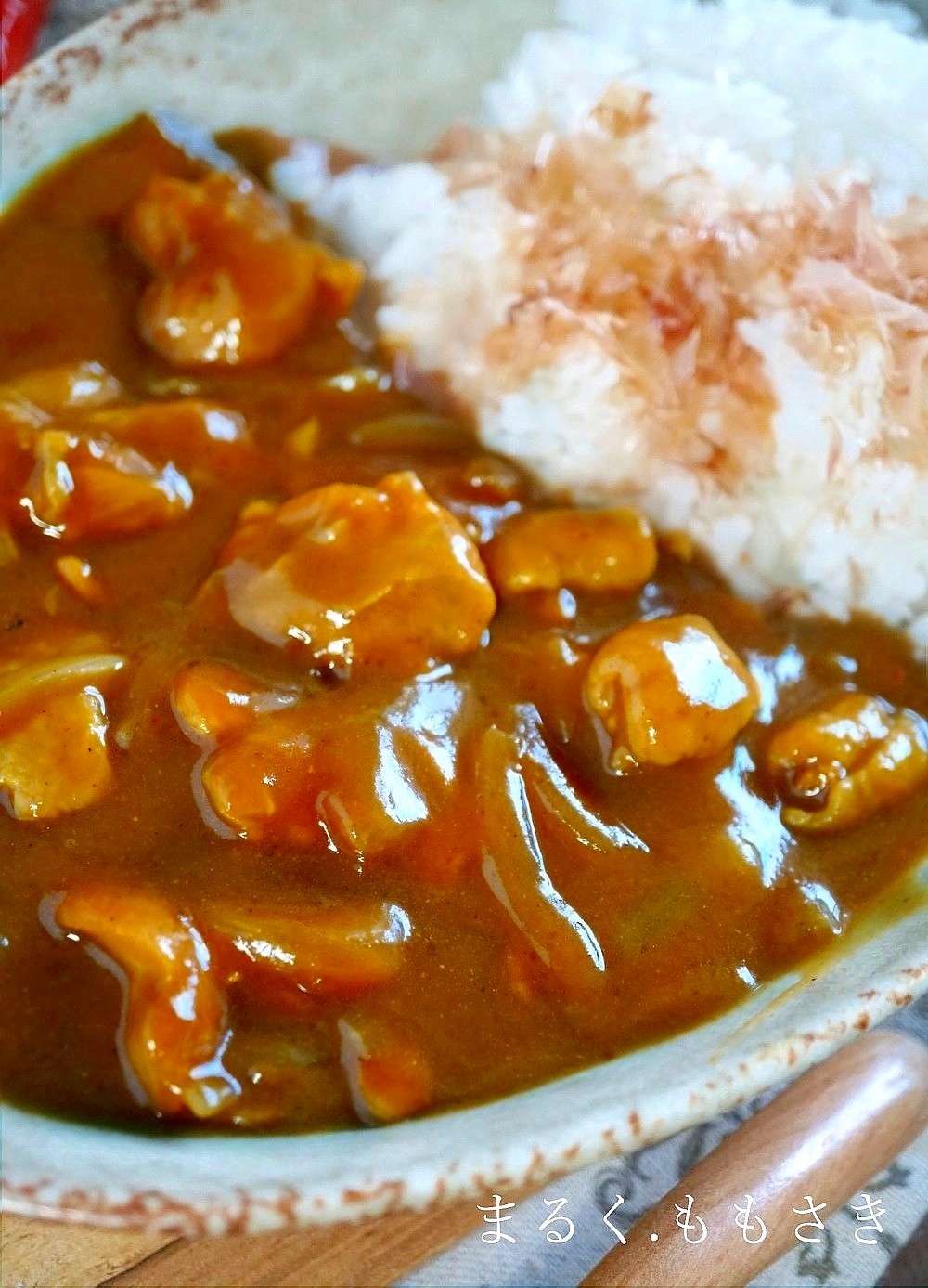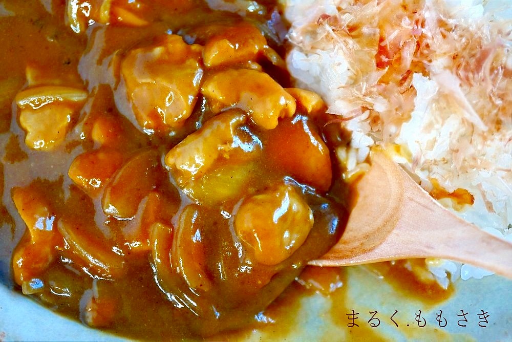 フライドオニオンのトッピングも合うけど、今回はご飯に鰹節をトッピングしました。これ出来立ても美味しいけど、次の日のカレーはさらに深いお味です