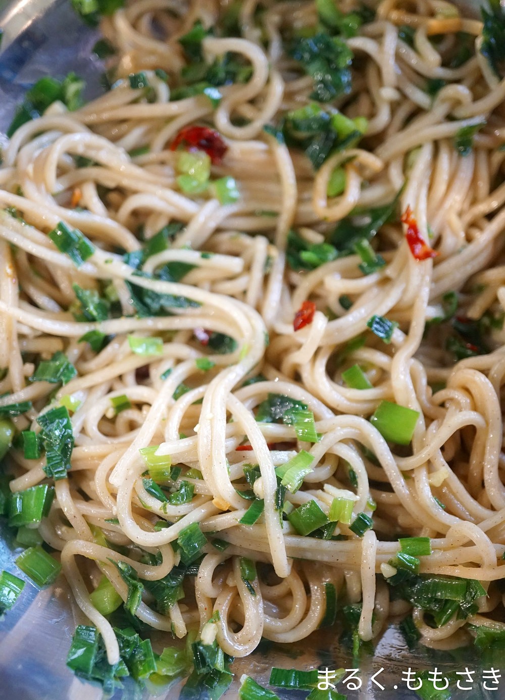春にNiziUが緑の具材?に和えた韓国の麺を食べているのを見て、何か全くわからなかったんですがそれにインスパイアされ、市販の流水麺のそばとニラを使い、ごま油と鷹の爪でぱっと炒めてみました!