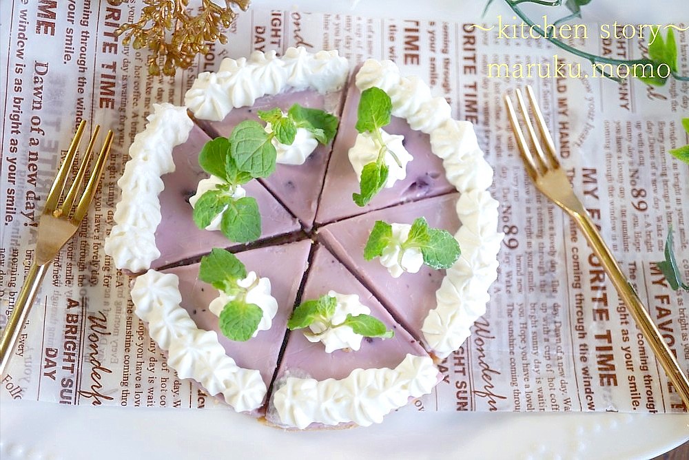 上から見てもブルーベリーのレアチーズケーキ♪もともとの三角を使って作っているので、切り分けも難しくない
