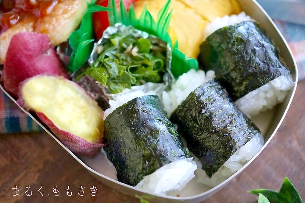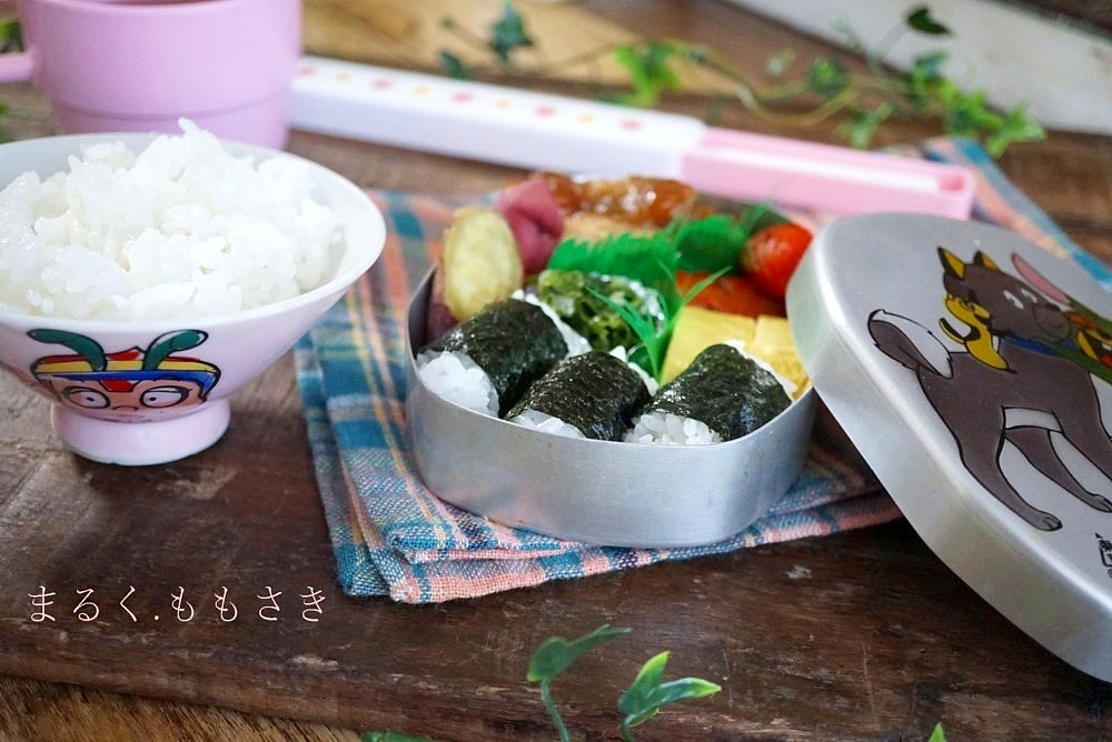 小さいサイズなので、子供さんが一口で食べやすいおにぎりを握り、海苔で巻きました