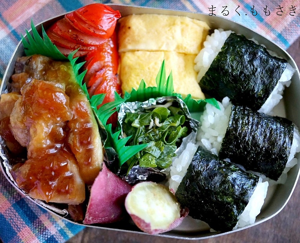 おかずはこんな感じが多かったですよね^^;照り焼きチキンは朝お弁当に実際詰めた残り。大根葉とじゃこの炊いたん、ふかしたお芋さんは実家の母が作って前日に持ってきてくれたものが丁度あった!赤いウインナーは私自身は食べたことないけど昔ポイかな?と(笑)卵焼きはいつの時代も絶対ですよね
