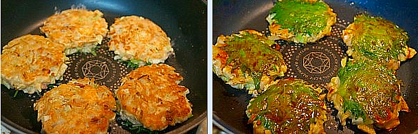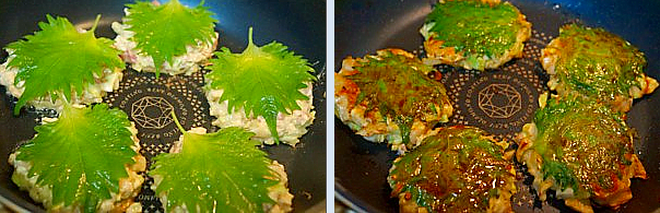 4裏面を返すとこんがりです。青シソの方も焼きます。少し焼いた後、蓋をして中まで火を通す。