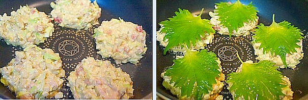 3フライパンに油を大さじ半分入れ生地を丸く入れる。片面の上に青シソを乗せる。