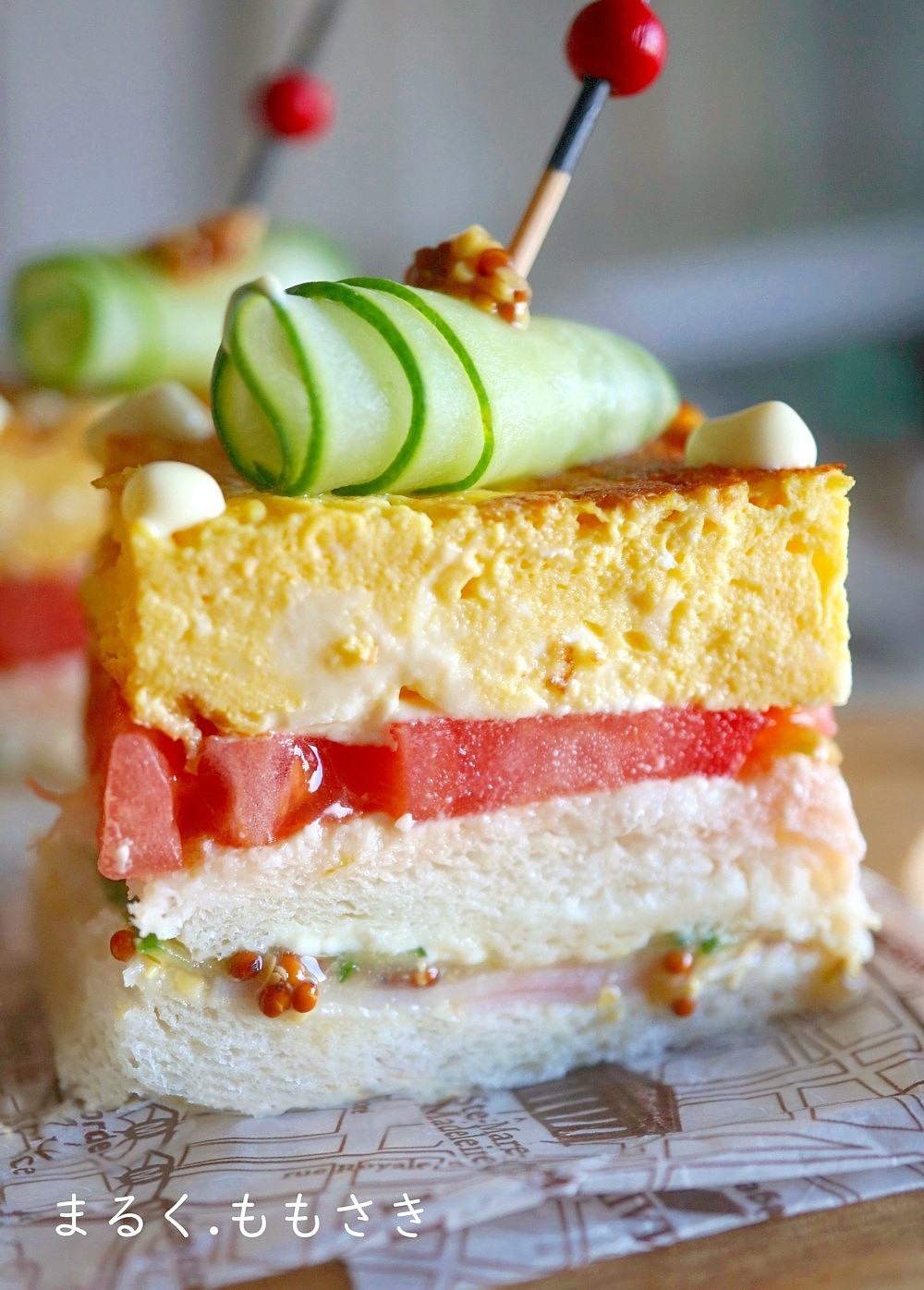 もう1枚のパンを乗せバターを塗り薄切りトマトを半分にカットし乗せ、マヨネーズを適量かける。1番上に2の卵を乗せる。