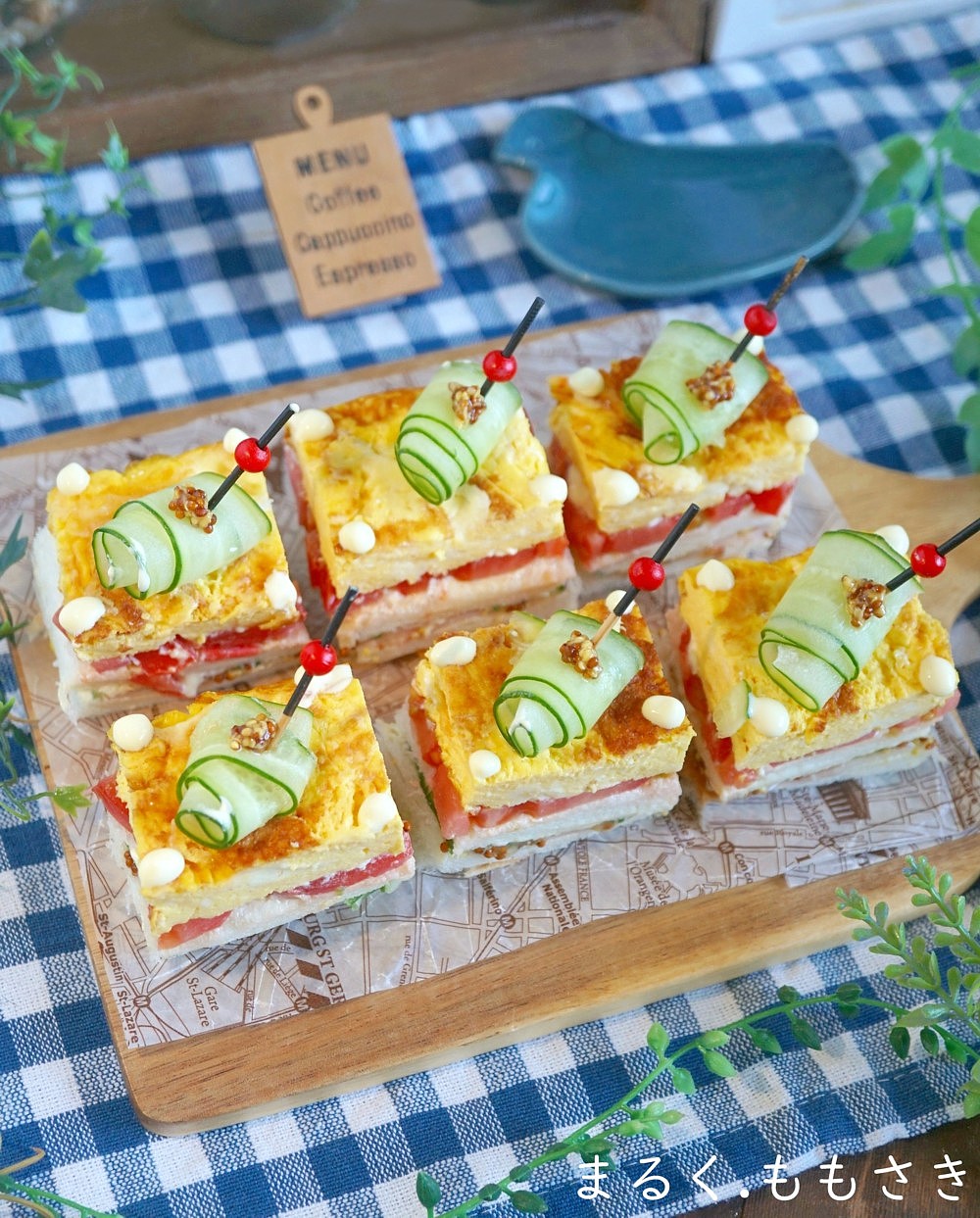 食パンを使ったミニサンドです。普通の具を使っても乗せる順番や見せ方で、オードブル風にもなります