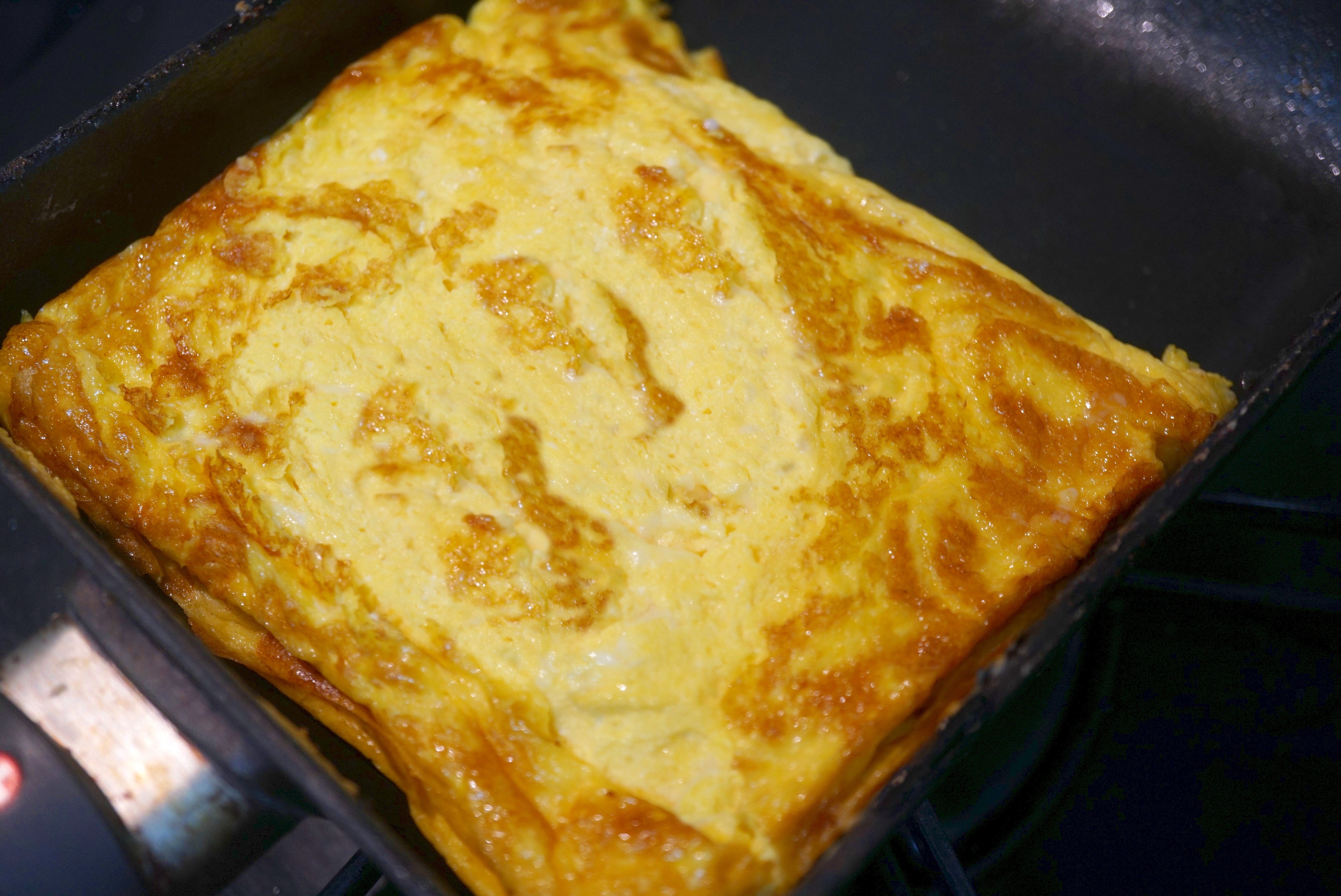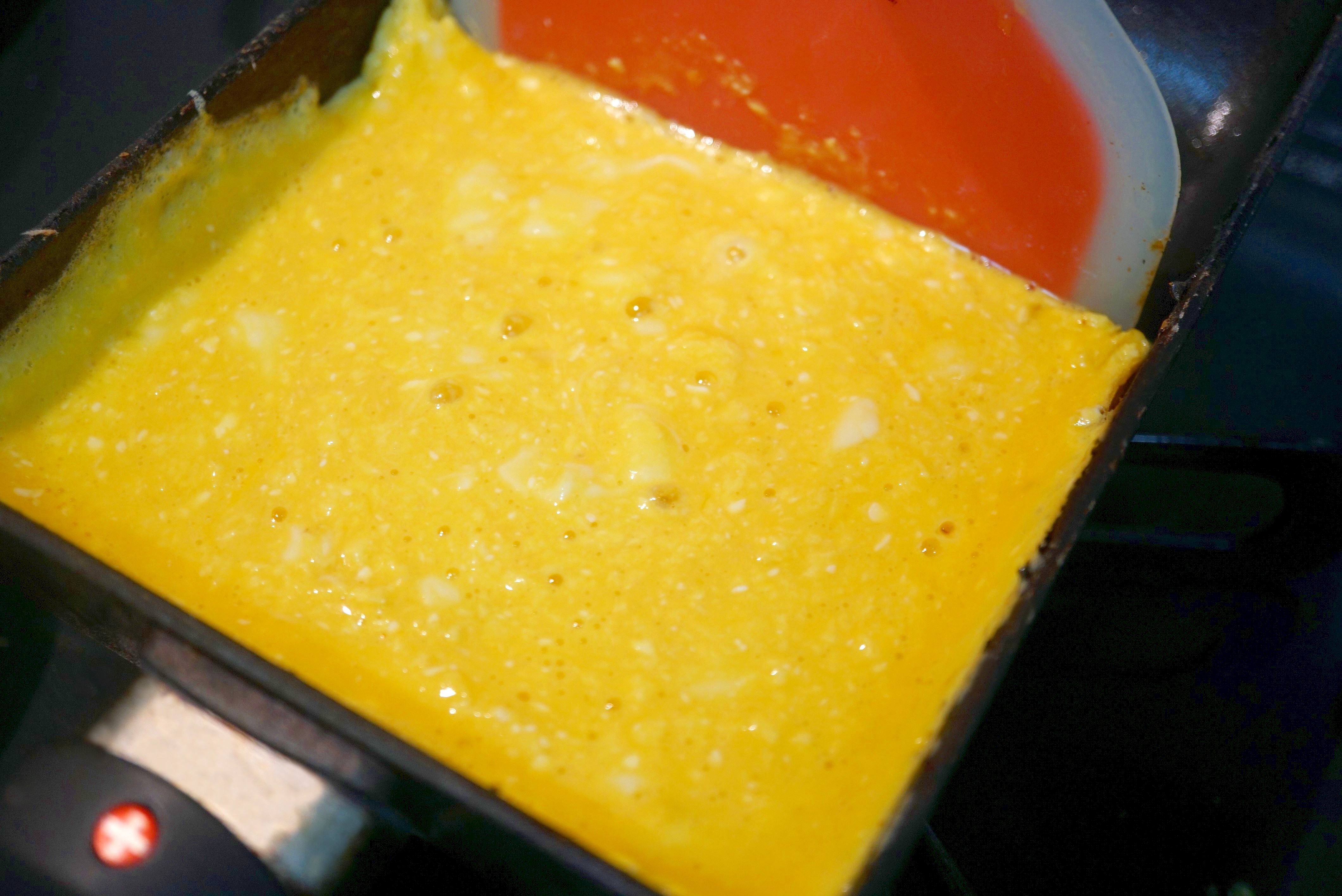 温めた卵焼き気にオリーブオイルを入れ2を流し込み、ヘラでさっと抑え7割程のサイズの中で止める。※普通に全部のサイズで焼いても可。