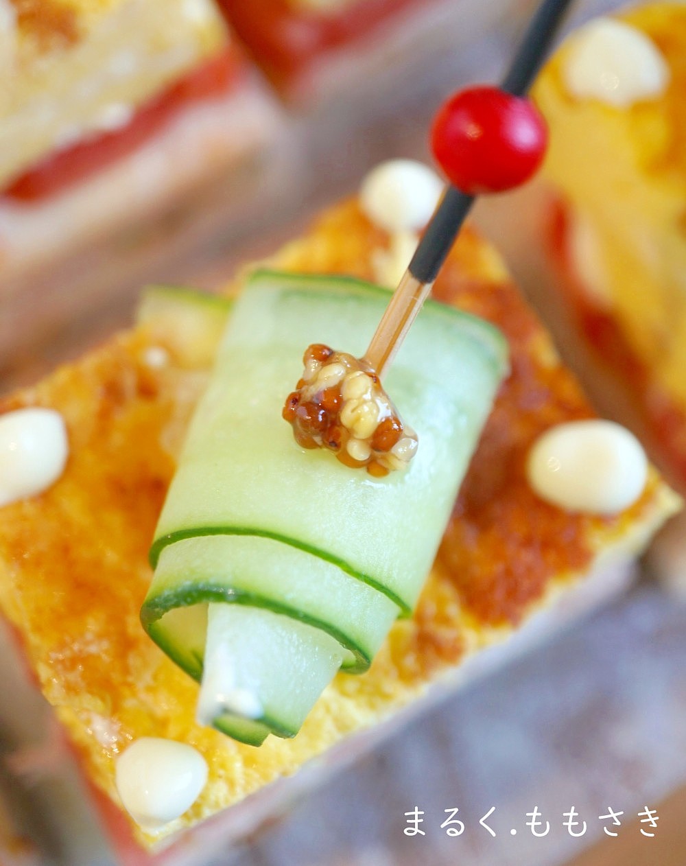 卵の周りにマヨネーズをちょんちょんと搾り、上に残りのきゅうりをピーラーで剥き、クルリと巻きピックで1番上に差し種入りマスタードを乗せる。