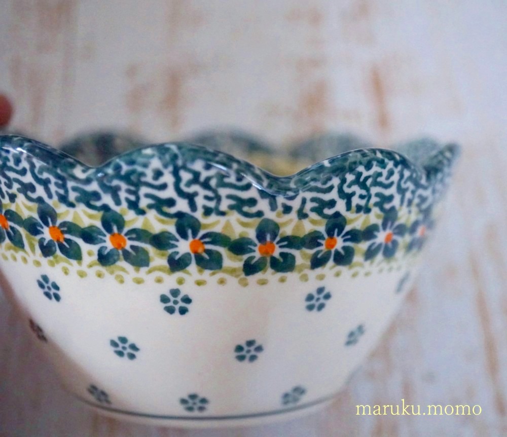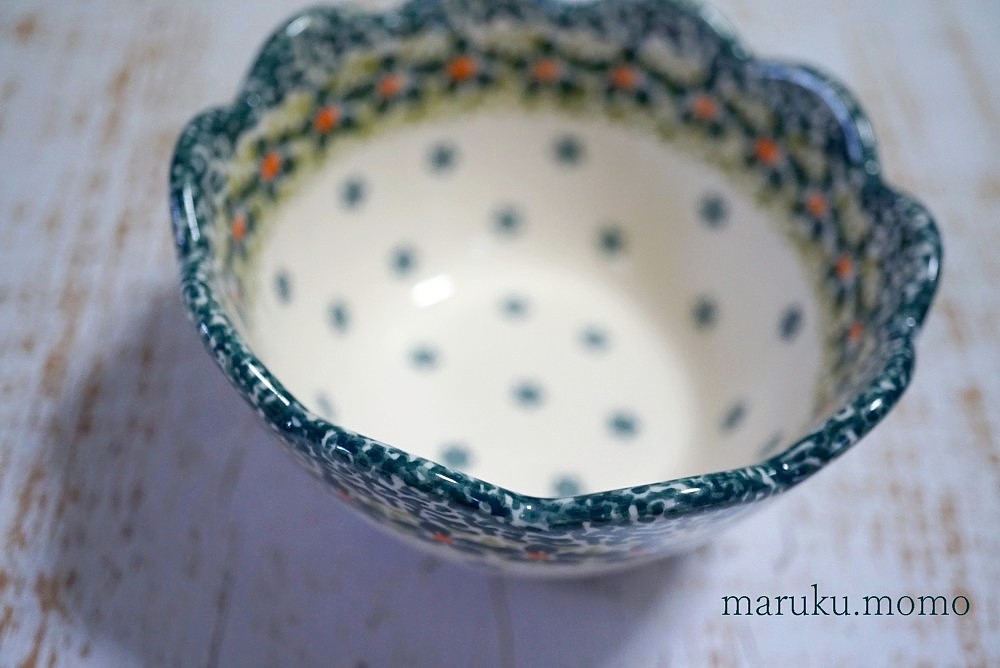 底に向かうほど窄まっているすり鉢型の形状で、縁の部分が花弁のように見える愛らしいフォルム。ポーリッシュポタリーらしく外側にも内側にも絵付けされています。クリーム色の生地深緑と黄緑色の2つの色使いで、シンプルながら落ち着いた仕上がりになっています。