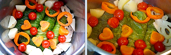 今、キャベツがお高いのでレタスで巻き根菜のレンコンやジャガイモ、ニンジン、トマトを一緒に煮込んだポトフにしました。